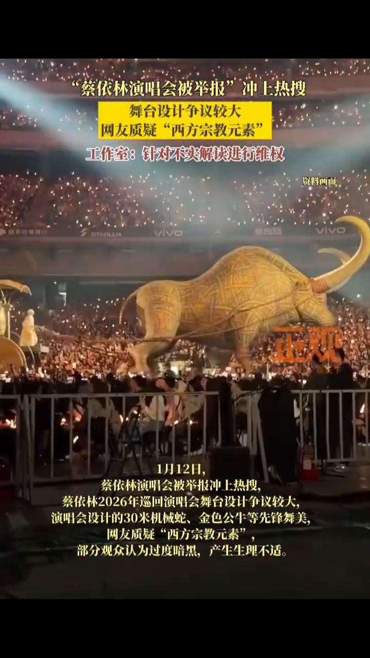 "蔡依林演唱会被举报"冲上热搜,舞台设计争议较大,网友质疑"西方宗教元素"。 工作室:针对不实解读进行维权。主办方已发布严正声明,澄清舞台灵感源自15世纪荷兰名画《人间乐园),整体以"自我觉醒"为主题,通过五大章节探讨人性与欲望,属艺术创作范畴,并非宗教传教或迷信活动。爬竿杂技融合江苏非遗技艺,强调文化创新与女性力量表达。 蔡依林演唱会被举报冲上热搜,蔡依林2026年巡回演唱会舞台设计争议较大,演唱会设计的30米机械蛇、金色公牛等先锋舞美。