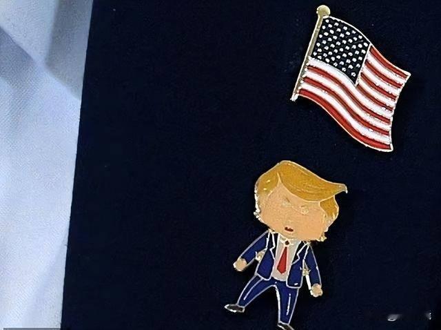 特朗普戴了一个新的“快乐特朗普”翻领别针,图案是特朗普卡通化的大脑袋和张大嘴巴的表情,美国网友表示,特朗普看起来像经典“摇头娃娃”版的总统。 特朗普没有说是谁给他的别针。“考虑到我从不快乐,我从不满足,”总统继续说,伸出翻领,低头看了看别针,然后带着顽皮的傻笑回头看了看记者。“在我们让美国再次伟大之前,我永远不会满意,但是我告诉你,已经非常接近了。这就是所谓的快乐王牌。” 美国媒体解读特朗普高频佩戴这枚别针,和国旗别针叠戴,树立个人标志,也是用“亲民卡通符号”包装他民族主义与霸权主张的视觉操作。