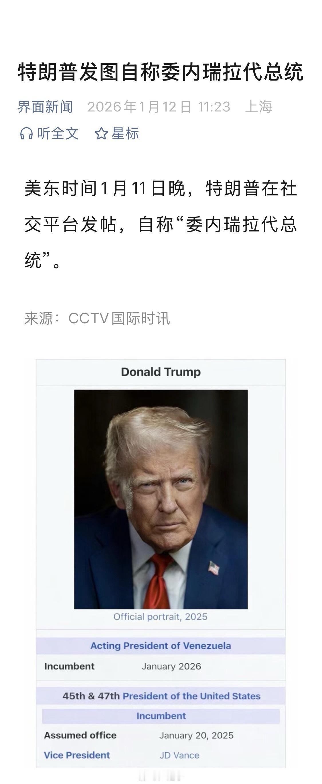 川普自封自己为委内瑞拉代总统!