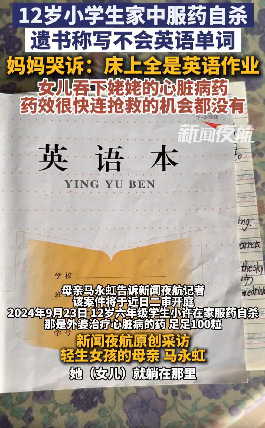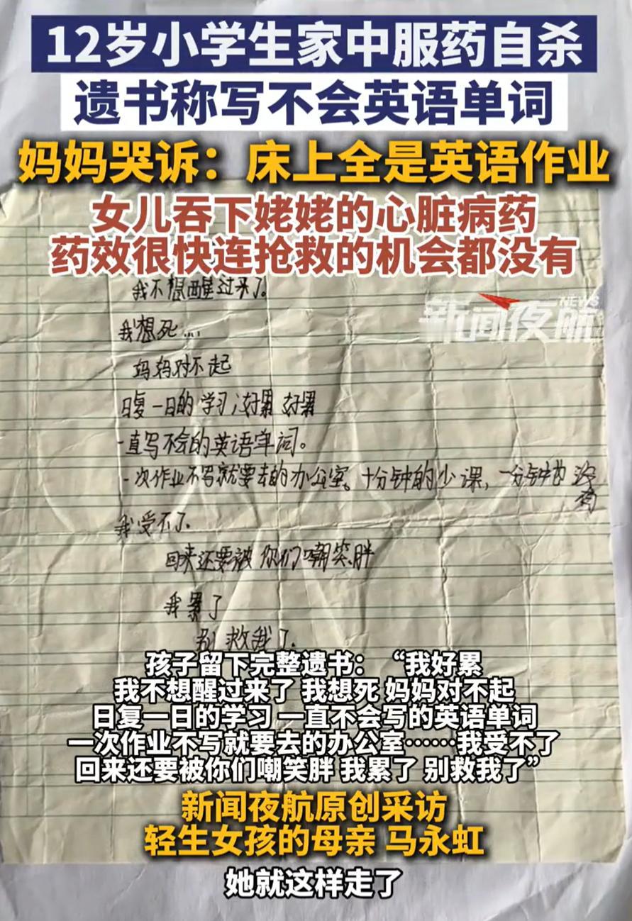 江苏,一名12岁小学生在家中服药自杀,母亲回家后看到遗书和床上的英语作业,将学校和老师一起告上法庭,不过不仅遭到法院驳回,就连网友也不站在她这一边:为什么不反省一下遗书后半部分? 据女孩母亲马女士介绍,当时孩子的床上全都是英语作业,她哭着说,如果没有英语作业,女儿就不会走了 而从遗书的内容来看,孩子表示每天日复一日写不会英语单词很累,会被老师叫到办公室,回家还会被你们嘲讽,还说我胖 很显然,这位家长把重点都放在了英语作业上面,于是把学校和老师给告了,不过法院认为,仅因任课十余天的老师要求其订正作业,将其喊到办公室沟通和辅导即导致自杀,其间的因果关系难以认定 不少网友都在讨论要不要学英语的问题,但我觉得,这里面英语并不是完全的重点 我注意到一个细节,这位母亲在发现女儿出事时,第一反应是英语作业的问题。这种反应很真实,很多家长都会这样,把问题归结于外部因素:作业太多、老师太严、学校压力大 但孩子的遗书明明白白写着,她累的不仅仅是学英语这件事本身,而是那种日复一日的挫败感,是来自学校和家庭的双重压力 教育孩子从来不只是学校的责任。学校教知识,家庭给温暖和支撑。当孩子在学校遇到困难时,家应该是她的避风港,而不是另一个让她感到压力的地方 那个女孩在遗书里提到的“嘲讽”,可能只是家长眼中的玩笑或“激励”,但在一个已经在学校受挫的孩子心里,这些话语的重量可能是我们无法想象的,或许家长当时上点心,少一点嘲讽,多一点鼓励,结局都会不同