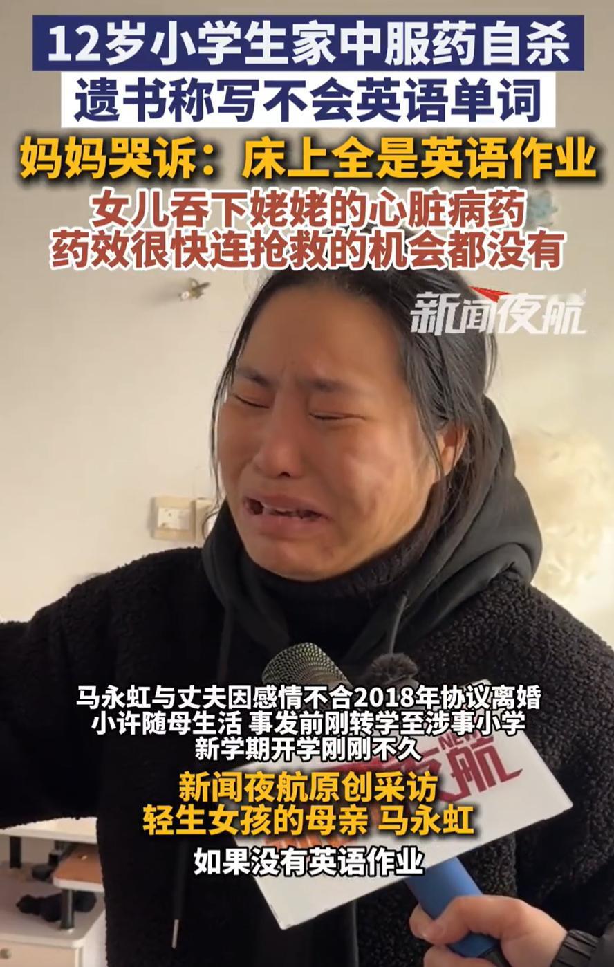 江苏,一名12岁小学生在家中服药自杀,母亲回家后看到遗书和床上的英语作业,将学校