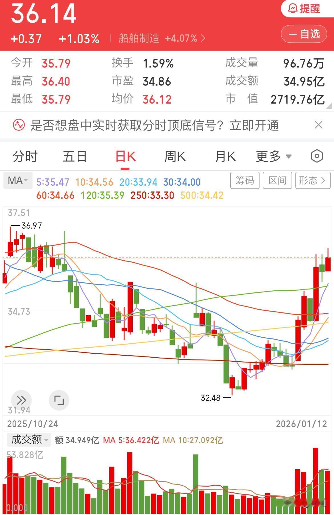 船舶还会上涨吗? 今日船舶全天在水上震荡,涨幅达1.03%,主力资金净流入2.4亿。可它还是没能跑赢板块,在中字头里也处于落后位置,只能说表现平平。 后续走势会怎样呢?目前船舶对前期平台高点36.9左右呈围而不攻之势。这表明还需进行筹码换手,平衡场内持仓成本,待时机成熟便会一举突破37的压力位,进而冲击38。 后期38 - 40是巨大的压力区间,需要更大规模的换手才能实现突破。38是个分水岭,若无法站稳38,就会回调蓄势。 别再看空船舶了,大盘都快到4200点了。即便它回撤,又能回撤到哪儿呢?34.8的价位还不知有没有机会出现。 虽说大盘股的弹性比不上科技股,但胜在稳健。 大盘明日大概率会冲高回落,做好坐过山车的心理准备。 船舶 船舶行情 船舶走势 中国船舶 大盘走势