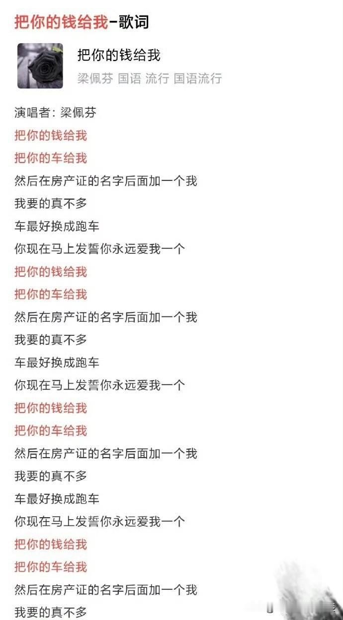 “张口就要车房加名,这婚还结不亏?”哥们儿,最近刷到段子,姑娘把“钱、车、房加名”编成歌唱,听着乐,细想却扎心。婚姻哪是财产过户,而是两份担当凑成个“家”。三十好几的爷们儿,谁不是咬牙奋斗攒下点底子?她要跑车,你要养家,不如聊聊俩人怎么一起踩油门往前奔。真心过日子的人,看的是你凌晨为她留的灯,不是你房产证上能挤几个名。 爱不是掏空你的口袋,而是往里头添柴加火——你说是不是?你身边有这种“物质考验”的故事吗?评论区唠唠!