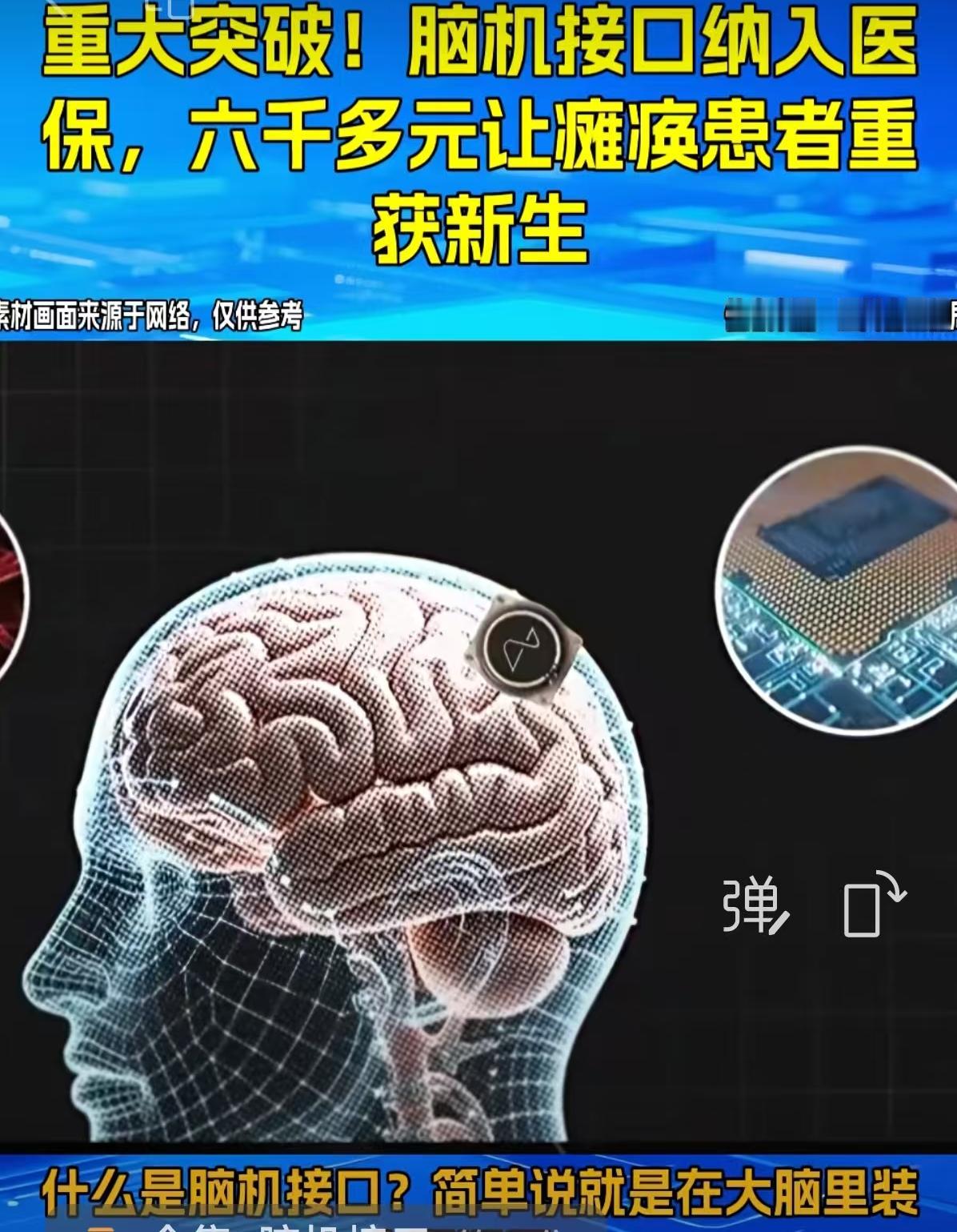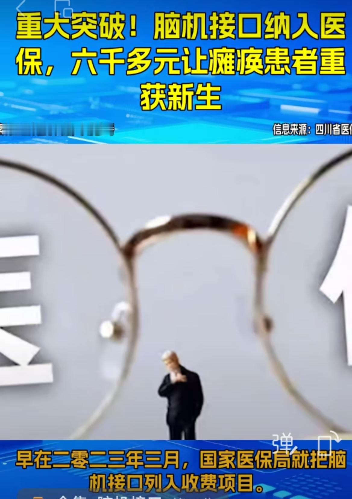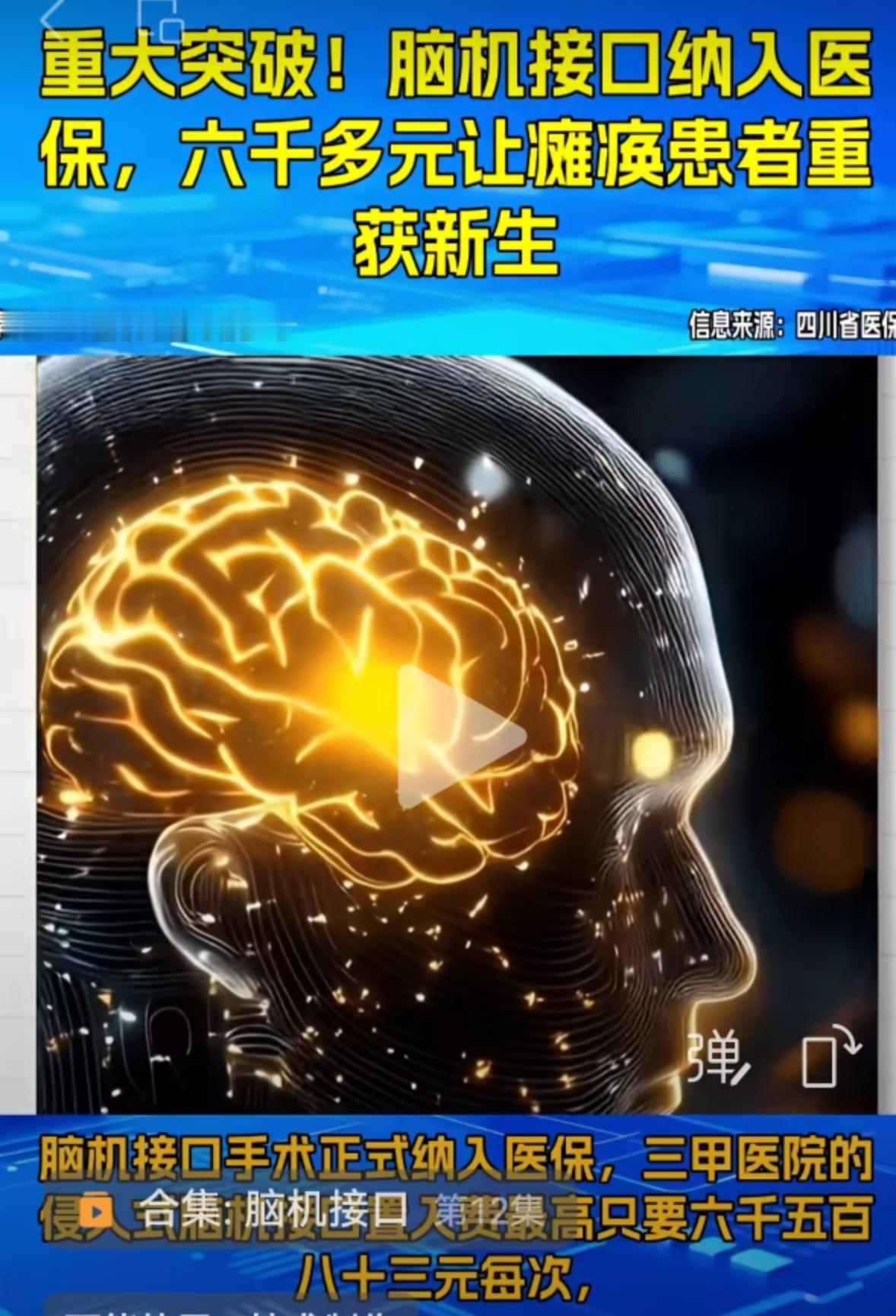 科幻电影里的情节,正在我们的医保账单上变成现实。 就在刚刚,四川省医保局传出了一个足以让无数神经受损家庭热泪盈眶的消息:脑机接口植入手术正式收费,价格定在了每次6583元。这不是天价的科研实验费用,而是纳入了正规三甲医院收费体系的定价。对于普通家庭而言,这不仅仅是一个数字,更意味着那些因为瘫痪、渐冻症而被困在身体里的灵魂,终于有了用得起、能普及的“解药”。 我们要搞清楚这个6583元到底意味着什么。很多人第一反应是“不敢相信”,毕竟在过去的认知里,脑机接口是马斯克那样的大佬玩弄的高科技,动辄百万美元。但在四川,这项技术已经从实验室走向了临床。这笔费用包含的是在颅骨上植入微小电极或设备的手术操作费。把它换算成我们熟悉的物价,可能只是一部普通高端手机的价格,却换来了一个瘫痪患者重新抓握水杯、甚至重新开口说话的可能。 技术的原理其实并不晦涩。你可以把它想象成在大脑里装了一个“翻译官”。大脑思考时会产生脑电波,对于健康人,这股电流能顺着神经传给手脚;但对于瘫痪患者,这条路断了。脑机接口就在断路的地方架起一座桥,直接读取脑电波,把它翻译成数字信号,指挥外部的机械手或者电脑光标。你想抬手,机械手就抬手;你想打字,屏幕上就出现文字。这种“意念控制”不再是魔术,而是标准的医疗流程。 这一突破并非一日之功,而是国家层面的长期布局。早在2023年3月,国家医保局就展现出了极强的前瞻性,将脑机接口纳入了立项收费的探索范围。这在当时就是一个极其强烈的信号:国家准备为这项技术买单。随后的推进速度更是惊人。工信部联合其他六个部委直接发文,将脑机接口明确写入“十五•五”规划的重点产业名单中。 更具体的规划时间表已经摆在那里:2027年和2030年,是这个产业发展的关键节点。这不仅仅是医疗技术的突破,更是产业链的重塑。四川这次官宣的6583元收费标准,其实就是这盘大棋落地的一个重要缩影。它标志着这项技术已经脱离了单纯的科研实验阶段,进入了大规模临床应用的成熟期。 对于患者家庭来说,这种变化是实实在在的生存质量的飞跃。以前,神经系统的损伤往往意味着终身卧床,家庭需要投入难以承受的人力物力去照护。而现在,通过一次几千元的医保手术,患者可能恢复部分自理能力。这种“性价比”,是无法用单纯的金钱来衡量的。国家用真金白银的政策托底,把曾经的“黑科技”打造成了老百姓看得起、用得上的“普惠医疗”。 这就是科技最温暖的模样。它不再高高在上,而是俯下身来,听懂了那些无法发声者的呐喊。6583元,买断的是绝望,开启的是新生。 以上内容仅供参考和借鉴