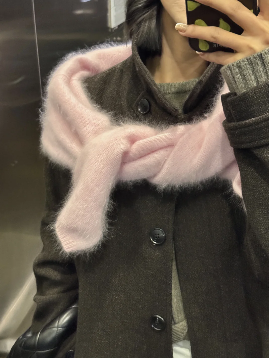 一位长相漂亮、身材出众的姑娘,穿上了一件对身材要求极高的紧身款一字肩粉色针织衫搭
