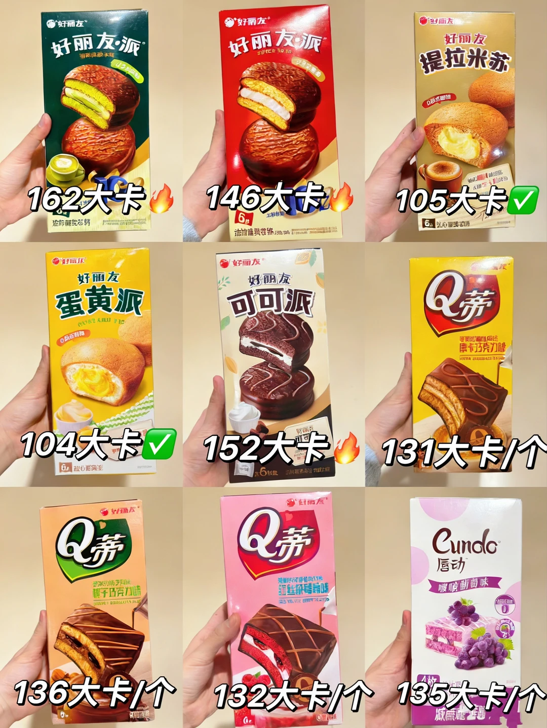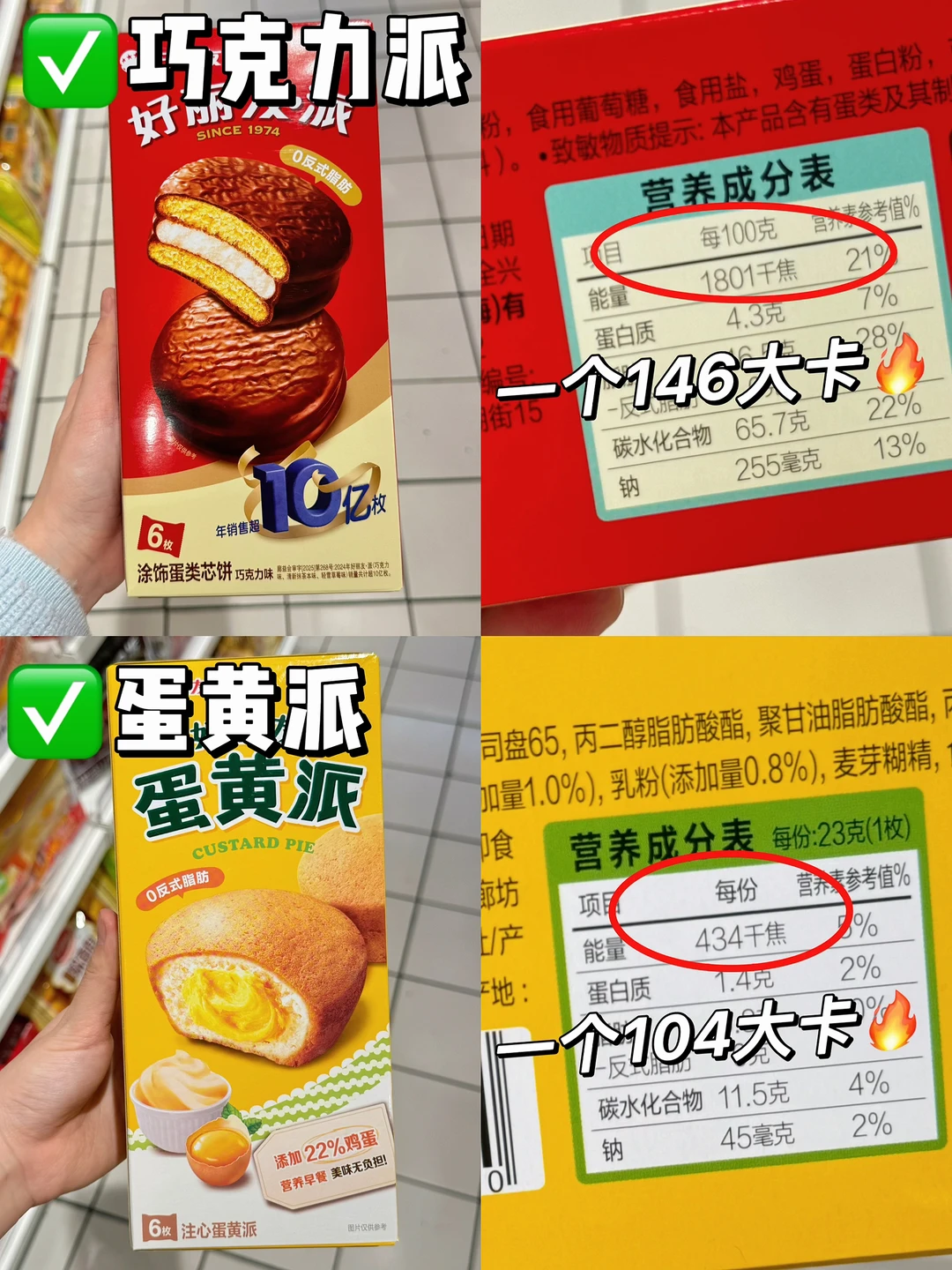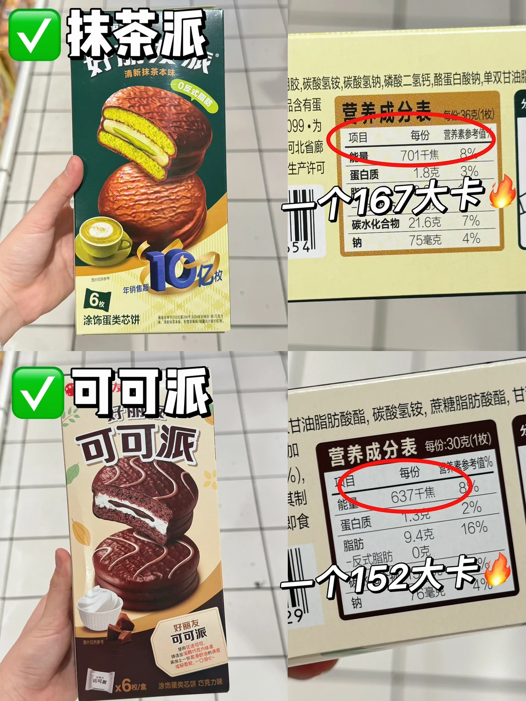 🔥热量高:抹茶味,可可味,原味 🔥热量低:提拉米苏味✅蛋黄派✅ 我真的超爱可可派!!谁懂呀!!从学生时期到上班 一次能吃两三个[笑哭R],当早餐刚好当零食就有点多了~ ~~~~~~~~~~~~~~~~~~~ 👉你们觉得哪个比较好吃,平时都喜欢吃哪个呢?? 可以参考热量算下自己一次吃多少大卡??