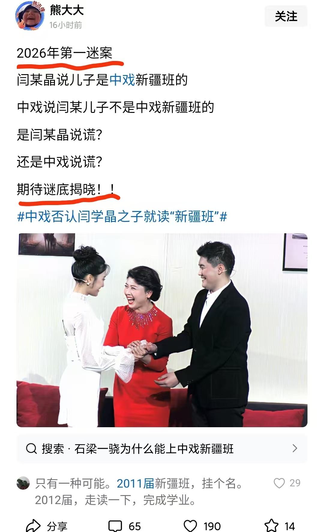 说说闫学晶的事 不看直播,只是在睡前看看短视频,图个开心。而最近演员闫学晶直播内容,引发争议的事,我觉得奇怪。 这直播带货,比如说如董宇辉样,对要带的货做足功课,给粉丝们提供性价比高的选择,完全可以理解,正常的市场营销活动嘛。 但是,这如闫学晶样的直播聊天,就让自己纳闷了。不是说,人以类聚物以群分,不是“一类人”,那会有那么多的话。 话不投机,才是非常正常的现象。当然了,要是对“名人”生活感兴趣的话,自然就有吸引力了。否则的话,半句多,甚至引发冲突争议就成必然。 1972年出生的闫学晶,从“二人转”开始,后来成了演员,演过《刘老根》等影视剧,塑造的是“质朴勤劳善良”的角色,如今也算是名人了。 对她的直播带货,喜欢就购买;可想与她聊天,只能是受虐了。“穷的根源是懒”,“老农民种庄家一年也得十几二十万”,等等,显然,她新闻看的太多了。 而2025年底一场直播,当谈到儿子一家在北京的生活时,她直言到:“他一年不得个百八十万的,这个家才能运转,但他挣不来。一部戏就挣几十万,关键两口子工资没那么高”。 或许,闫学晶是想通过儿子一家的生活,来感叹“生活艰难”,但是,没想到的是,她的“诉苦”,在听众听来成了炫富。 估计,在北京有大平层,在三亚有奢侈房的闫学晶,压根就不知道,东大有6亿人月收入不足1000元,月收入2000元以下的达到7.2亿,月收入5000元以下的13.28亿,占总人口的94.87%。 面对这样的受众,闫学晶的话就有点讽刺与挖苦了。如此以来,难怪有很多听众直接破防了。 媒体说的是,公众人物与社会现实脱节的深层矛盾。其实也就是闫学晶所在的“阶层”与普通人已经差异太大。她的实话实说,对普通人而言,已经是“高不可攀”的奢望了。 尤其是当她信誓旦旦的说,儿子高考成绩偏低,只好报考了中央戏剧学院的“新疆班”,并成功入学时,听众只能羡慕感叹了。 不过,中央戏剧学院1月11日发文,直接指出闫学晶说的“不属实”,这就有点意思了。真的不属实吗?中戏在“抠字眼”,纯粹糊弄人罢了。 退一步说,闫学晶真的不知道她儿子是怎么上的大学吗?要知道,判断错了聊天“对象”的闫学晶,当时根本没有意识到“问题很严重”而已。 若闫学晶与她的“朋友们同事们”聊这些话题,说出这些观点或者言论,估计都会理解,也不会有如此麻烦。正因为东大“老百姓”太多了,对大人物仰视的时间太长了,听到如此赤裸裸的“真相”时,一时之间只能是争议了。 尽管网络上有关的信息很多,也包括“落马”官员们的各种“犯罪行为”,但是由一个演员名人亲口说出来,还是让人憋屈的。 当闫学晶社媒被禁止关注,代言的佐香园和统厨宣布解除合约,今年春晚也有点悬时,她着急了。赶紧在朋友圈发了一则道歉信,读罢令人忍俊不禁。 “思想出现严重偏差”,“灵魂动了一次手术”,“树立正确的”三观,“永远带着敬畏往前走”,等等,只能说依然是“不接地气”。 直播带货就带货,别想着与粉丝“唠家常”。毕竟,副是级转业的名人演员,其认知与身家绝对不是“老百姓”所能理解的。
