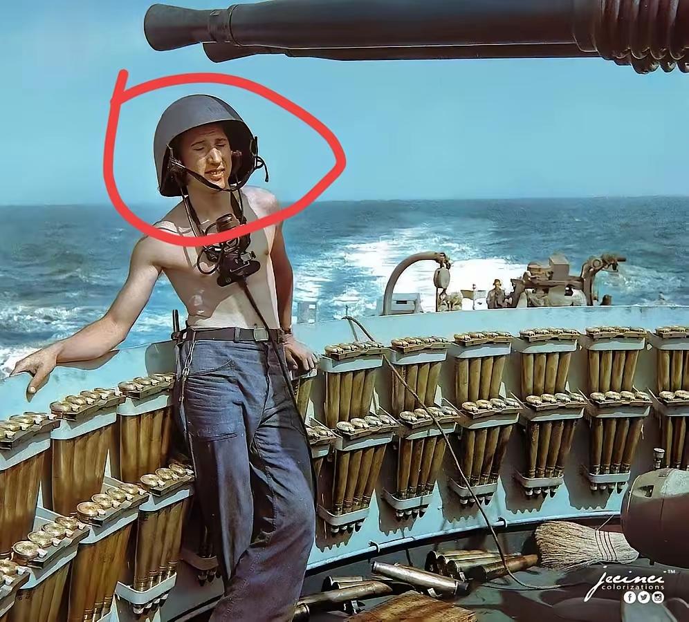 人们纳闷,二战的时候这位美军为何戴大头盔?据说这是防空炮兵,需要戴耳机接收指令,也在战列舰主炮开炮的时候回到舱内躲避冲击波。因为戴着耳机,所以头盔显的大一些。