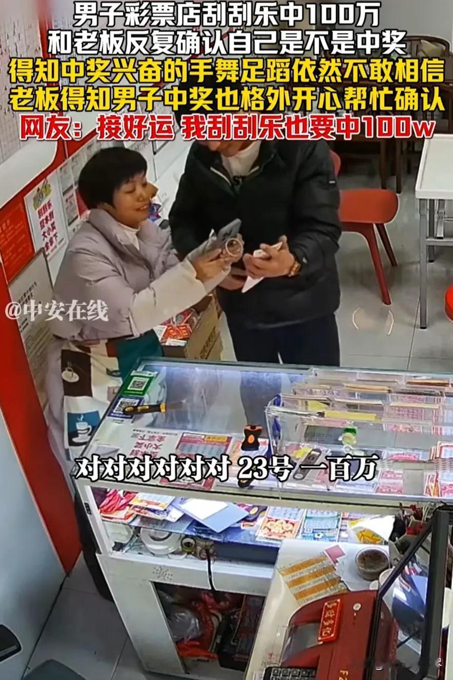 太幸运了!浙江,一男子在彩票店里刮刮乐,不料,刮到一半的时候,突然从座位上弹射起来,连忙拿着彩票到老板面前,让她帮忙看看是不是真的,老板还没明白怎么回事,可看了一下突然也激动起来,因为男子的这张彩票竟然中了100万。男子的手都开始抖了 浙江一家寻常彩票店里,午后的阳光透过玻璃窗洒在柜台前的刮奖区,零星几位彩民各自忙碌,有的低头核对号码,有的慢悠悠刮着刮刮乐,谁也没留意到,角落里正上演着一场让人热血沸腾的幸运时刻。 一名男子闲来无事走进这家彩票店,在柜台前挑了几张刮刮乐,付完钱后找了个靠窗的座位坐下,慢悠悠地拿出硬币开始刮奖。 他平日里就爱偶尔买几张刮刮乐,算不上痴迷,只是图个刮奖时的期待感,中个小奖能开心半天,没中也全当消遣,这次也是抱着随便玩玩的心态,一张一张耐心刮着涂层。 前几张刮下来,要么是谢谢参与,要么是几十块的小奖,男子脸上没什么波澜,依旧不急不躁地刮着手里的这一张。 他用硬币顺着涂层慢慢刮动,指尖传来熟悉的摩擦感,眼睛紧紧盯着逐渐显露的图案和数字,心里还在想着,要是能中个几百块也不错。 可就在刮到一半,一串醒目的数字随着涂层脱落慢慢显现时,男子的动作猛地停住了。他眨了眨眼,又凑近仔细看了看,不敢相信自己的眼睛,心脏瞬间砰砰狂跳起来,血液好像一下子冲到了头顶。 来不及多想,他猛地从座位上弹射起身,手里紧紧攥着那张还没刮完的彩票,脚步都有些踉跄地快步冲到柜台前,把彩票递到老板面前,盼着对方能帮忙确认。 彼时老板正低头整理着桌上的票据,还没明白发生了什么事,只觉得男子的反应有些夸张,随手接过彩票准备帮忙查看。 起初老板的神情还很淡然,可目光落在彩票上的瞬间,瞳孔骤然放大,紧接着整个人也激动起来,反复核对了好几遍彩票上的兑奖信息,确定这张彩票真的中了100万大奖。 一旁的男子看着老板激动的神情,心里的猜测得到了印证,紧绷的神经一下子被喜悦冲垮,握着彩票的手不受控制地开始发抖,连指尖都泛着白,脸上满是掩饰不住的震惊和狂喜。 他站在原地,一时之间竟有些手足无措,脑海里一片空白,只剩下“中了100万”这几个字在反复回荡。 店里其他彩民听到动静纷纷看了过来,目光落在男子和老板手中的彩票上,眼神里满是好奇,有人小声议论着,有人脸上露出羡慕的神情。 小小的彩票店里,原本平静的氛围瞬间被这份突如其来的幸运点燃,连空气里都弥漫着喜悦的味道。 其实如今刮刮乐中奖的新闻偶尔会出现,但能一下子中得百万大奖,依旧足够让人惊喜。 男子随手买来的一张刮刮乐,本是平淡日子里的小消遣,却意外收获了这份天大的幸运,从刮奖时的平静,到看到数字的震惊,再到确认中奖后的激动手抖,整个过程充满了戏剧性。 男子平复了好一会儿,才慢慢稳住心神,在老板的提醒下,小心翼翼地把彩票收好,反复确认了兑奖的相关流程和注意事项。 老板一边叮嘱他妥善保管好彩票,一边难掩笑意,嘴里不停说着恭喜的话,毕竟店里能开出百万大奖,对彩票店来说也是件值得高兴的事。 这份不期而遇的幸运,来得猝不及防,让普通的一天变得格外特别。男子握着那张承载着百万惊喜的彩票,走出彩票店时,连脚步都变得轻快起来,满心都是对未来的期许。 对此,你们有什么看法,欢迎评论留言~