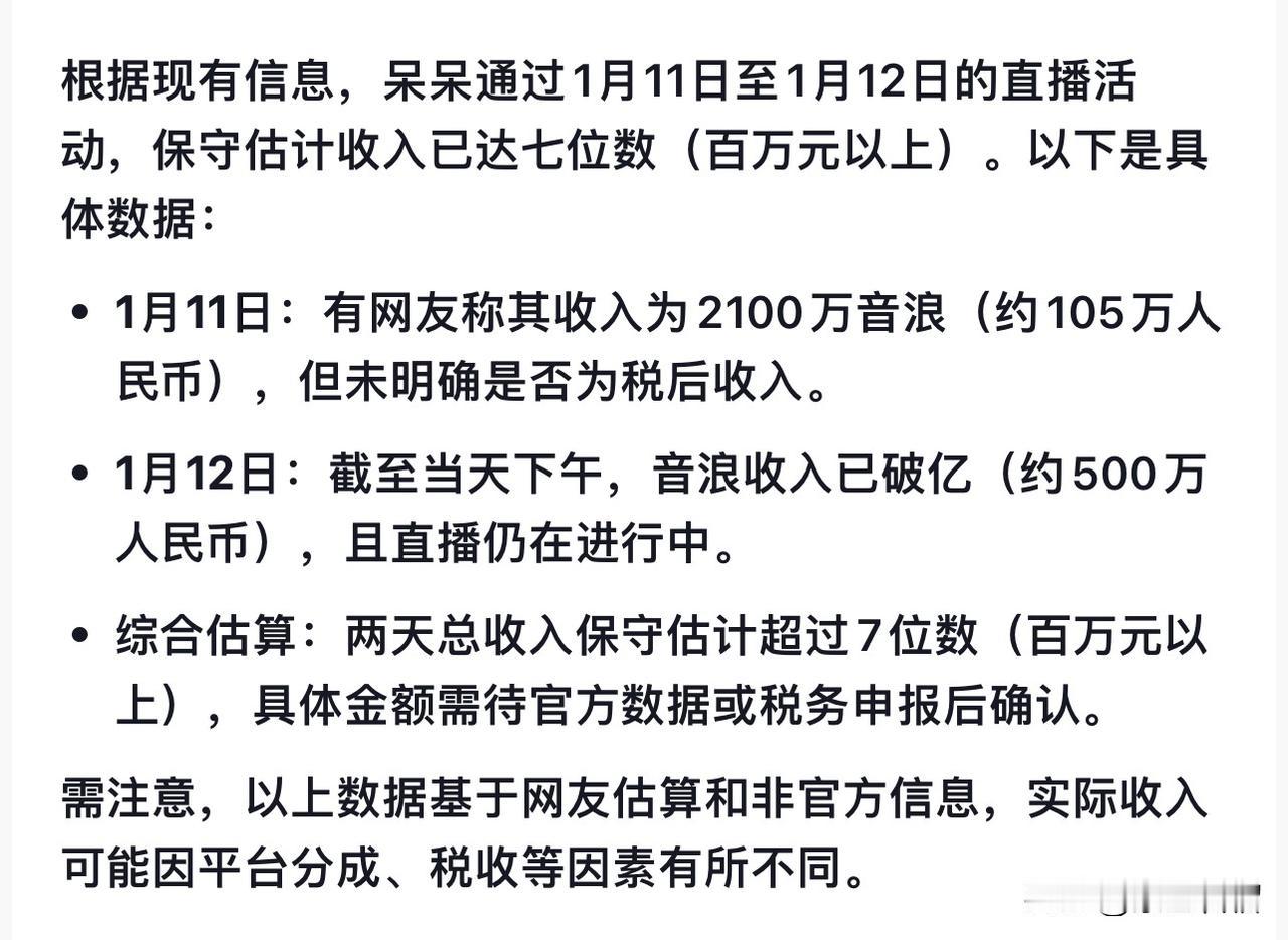 重庆合川的这位呆呆小姐姐告诉我们,梦想还是要有的,万一实现了呢! 估计她自己也没有想到,这泼天的富贵终于轮到自己头上去了。 网友计算了下,这几天虽然呆呆赔了五头猪,但是直播的收入足抵得上她十年的收入了。 1月11日直播收入约105万。 1月12日直播收入500万,还在持续增长中。 两天总收入税后至少300万以上。 对此,大家怎么看?欢迎评论区交流。 (图片来源网络)