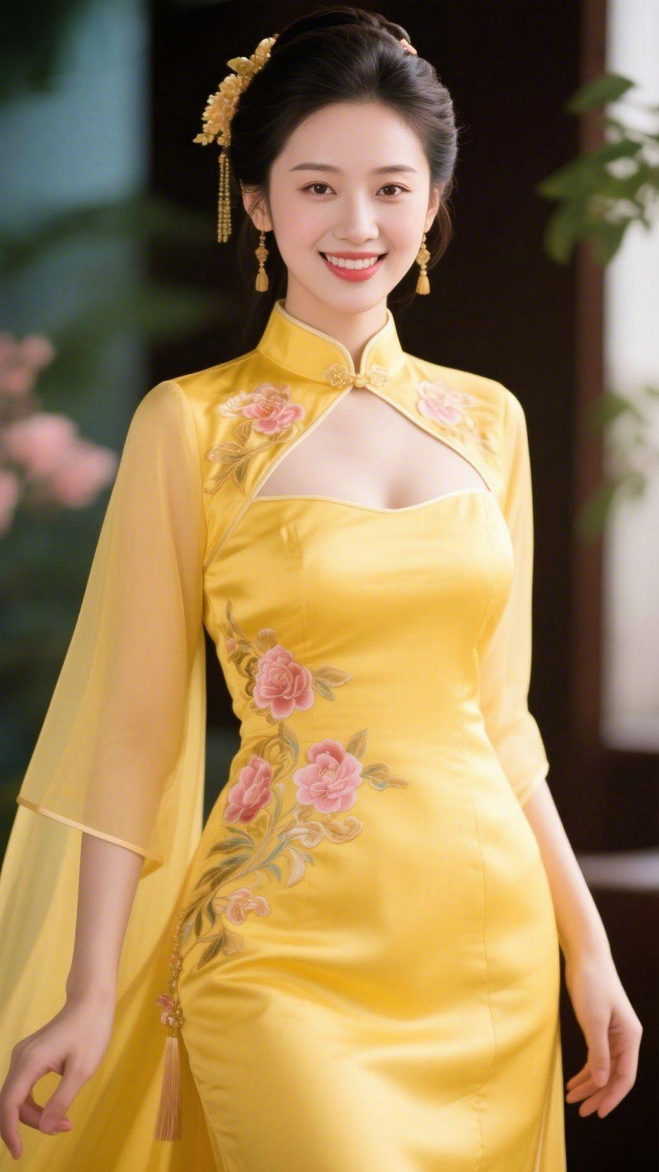 黄旗袍绽花间韵 雅致的室内,木窗旁晕着浅浅绿意,一袭明黄旗袍如揽了满城春光。领口的金质盘扣凝着中式精巧,裙身绣着的粉牡丹似刚从枝头折下,层层花瓣凝着细腻的针脚,与薄纱袖摆的飘逸相映成趣。发间的金饰流苏轻垂,随步履微晃,漾出细碎的光泽。 笑靥绽开时,像暖阳拂过盛放的花树,眉眼间的温柔揉着中式美学的明艳。指尖轻拂旗袍的缎面,触感顺滑如流云,这份雅致与鲜活,是东方服饰独有的韵味。不必远赴郊野寻春,身着这袭黄旗袍,便似把满园春色拥入怀中,也让人心底漾起对中式美学的无限偏爱,懂了传统服饰里藏着的诗意与浪漫。 国风旗袍 中式美学
