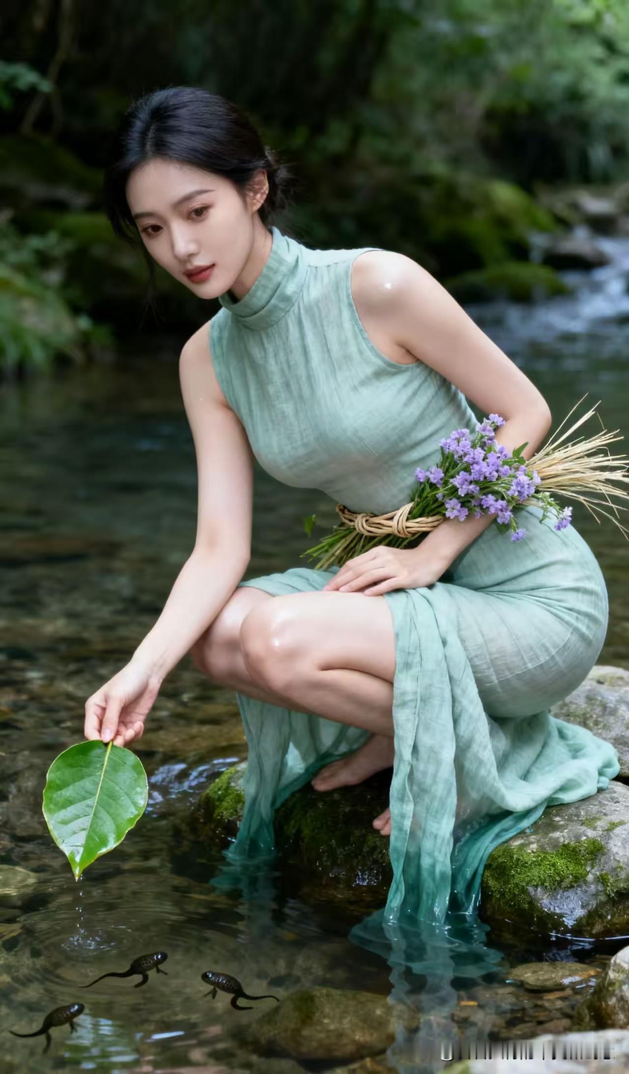 山坡羊·晨露亚麻裙 苔衣轻漾, 紫花新酿, 草茎柔系腰肢上。 石溪旁,影流芳。 裙摆漫浸清波浪, 阔叶舀来蝌蚪晃。 人,意趣长; 景,意趣长。