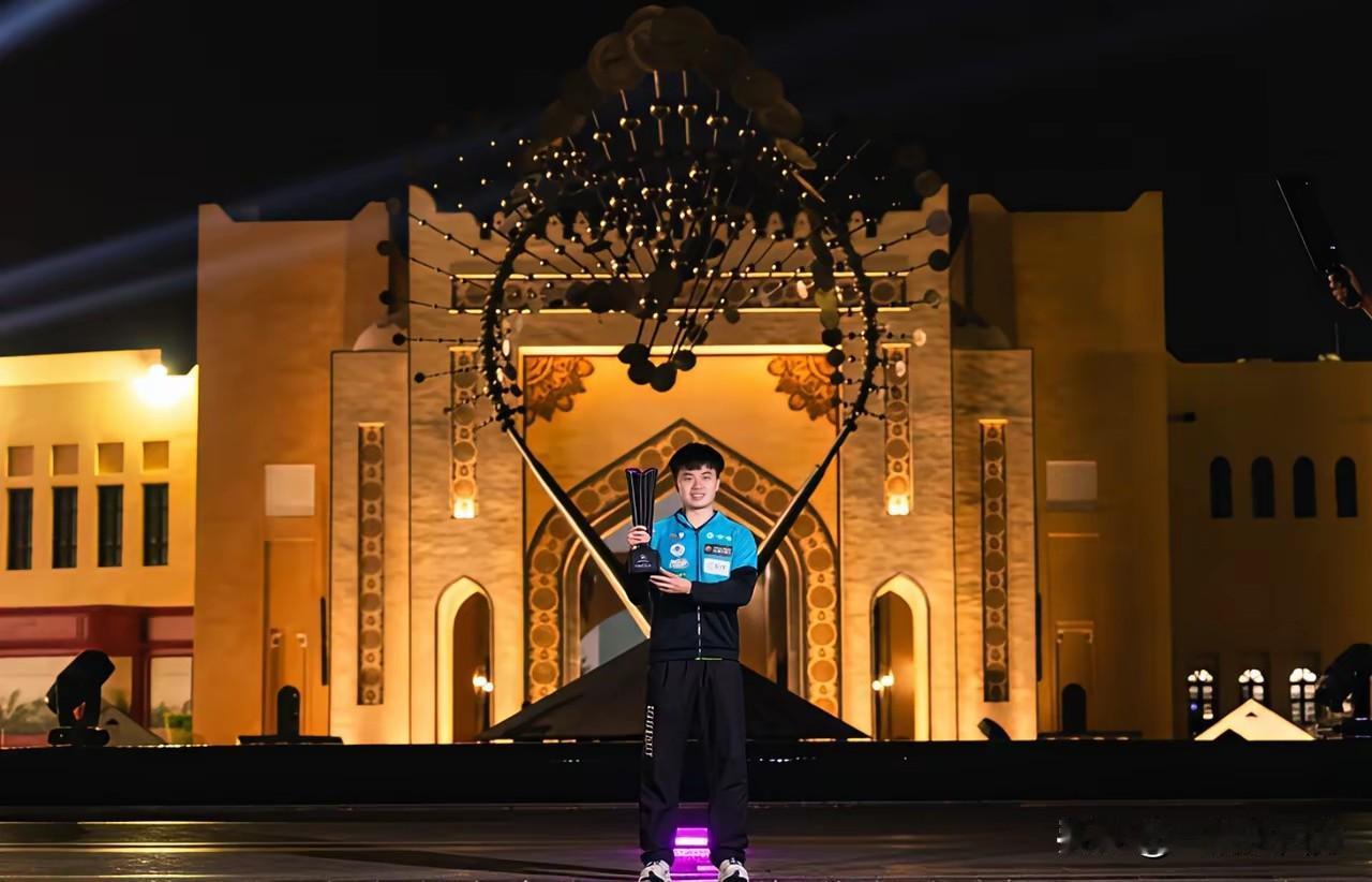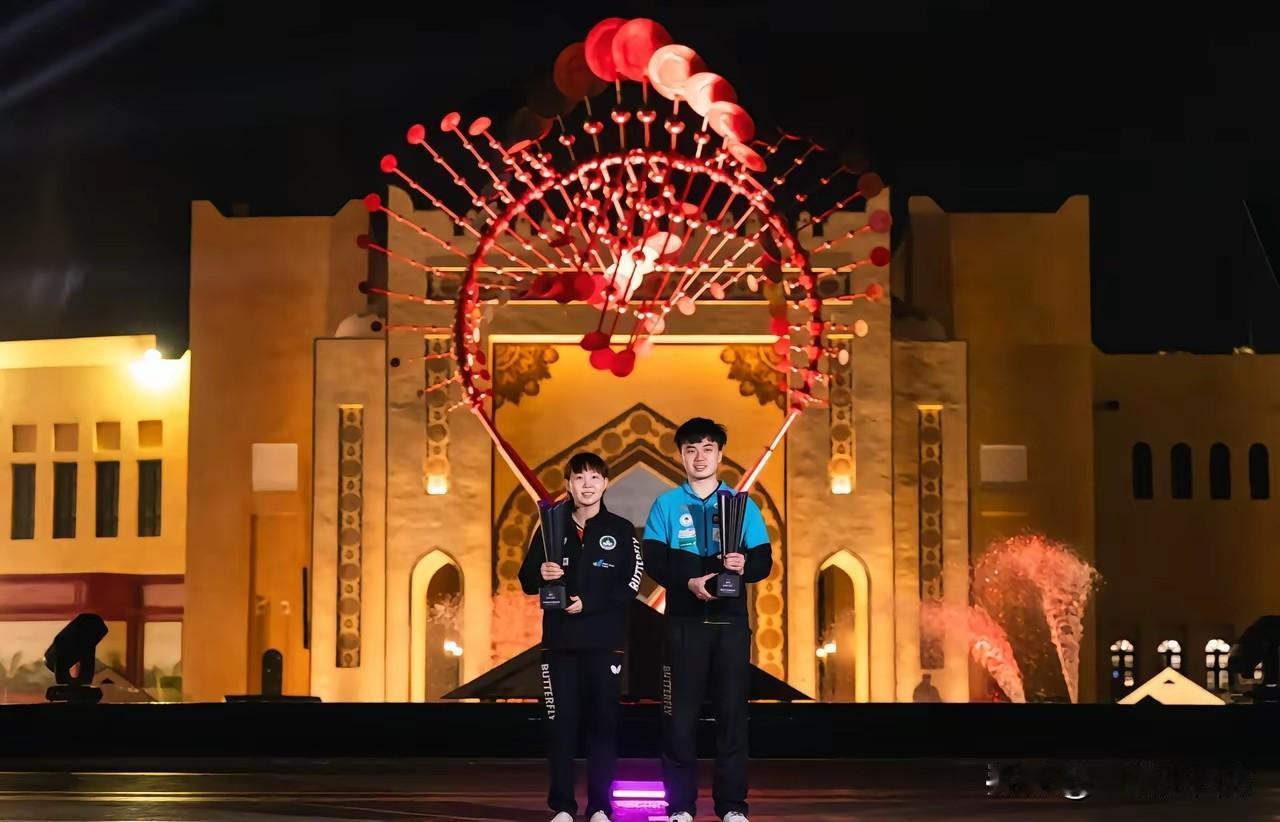 在WTT多哈冠军赛拿到男女单打冠军的林昀儒和朱雨玲在卡塔拉文化村拍摄城市宣传照
