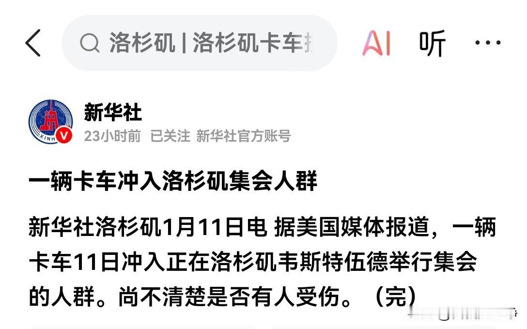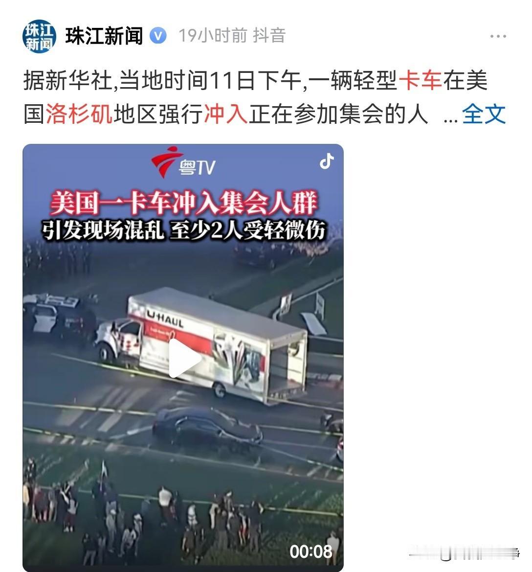 心净很早以前就说过无边界战争这个概念了。 而且多次强调,美国最危险的群体,其实就是卡车司机。 一旦这些人发疯,他们所制造出来的破坏力是十分恐怖。 大家看看预言这不就兑现了吗? 美国当地时间1月11号,洛杉矶一个集会,突然被一辆重型卡车强行冲入。 最新的消息报道称,有两人在这次冲撞中受伤。 愤怒的人群冲上去,控制住了卡车司机。 大家往后看吧,这就是一个开胃菜。 以后发疯的卡车司机会越来越多。 横冲直撞的汽车,它所造成的杀伤力要远比枪械更为严重。 这就是无边界战争的一种非常明显的表现形式。 防不胜防啊,防不胜防。 甚至后面很有可能这些卡车司机会往城市的水源地里面投毒,把大量的化学用品直接倾泻到水库里面去。 很多的流浪汉很有可能会去松高压电塔的螺丝破坏基础设施。 当然了,最经典的无边界战争就是拿一个打火机到处放火。 这些行动美国政府根本就防不住。 无孔不入啊,真的是无孔不入。