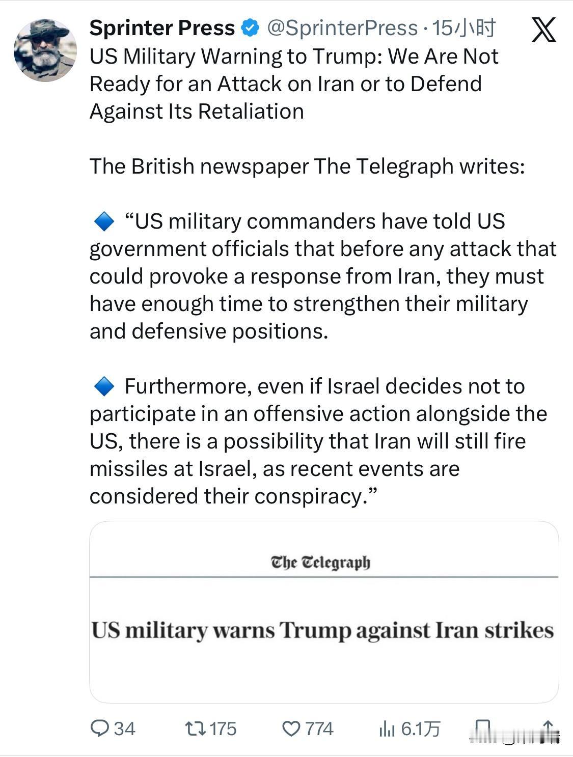 美国军方警告特朗普:我们尚未做好应对伊朗袭击或抵御其报复的准备。 英国《每日电讯报》报道: 🔹 “美国军方指挥官告诉美国政府官员,在发动任何可能激起伊朗反应的袭击之前,他们必须有足够的时间来加强其军事和防御阵地。 🔹此外,即使以色列决定不与美国一起参与进攻行动,伊朗仍有可能向以色列发射导弹,因为最近发生的事件被认为是他们的阴谋。