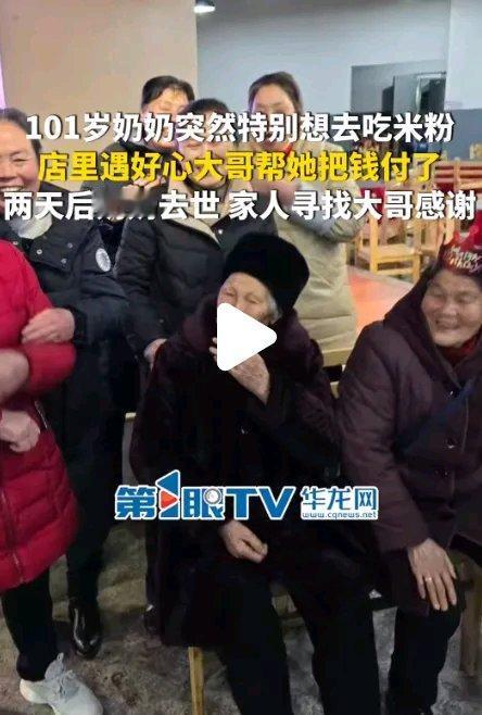 四川101岁奶奶想吃米粉,店里好心大哥把钱付了,奶奶追着道谢!2天后老人安详离世,家人急寻大哥感谢这件温暖又略带遗憾的事在当地引起了不小的反响。原来,这位101岁的奶奶一直都爱吃这家店的米粉,可子女们都在外忙碌,平时奶奶很少出门。那天,奶奶不知怎的特别想吃米粉,就颤颤巍巍地独自来了店里。 好心大哥在旁边看到老人拿着零钱数了又数,便主动帮她付了钱。奶奶虽然年纪大了,但心里明白大哥的好意,所以才追着道谢。 2天后,奶奶就安详地走了。家人在整理奶奶遗物时,发现了一张写着米粉店地址的纸条,还有奶奶用歪歪扭扭的字记录下大哥帮她付钱的事。家人们深受感动,决定一定要找到这位好心大哥当面致谢。 他们先是去了米粉店,店主回忆起当时的场景,也被大哥的善举感动,但他也不认识那位大哥,只记得大哥穿着一件蓝色的外套。 于是,家人在当地的社交媒体上发布了寻找好心大哥的消息,详细描述了事情的经过,希望能得到大家的帮助。消息一经发出,便迅速传播开来,网友们纷纷转发,大家都被这份跨越年龄的善意所触动。 很快,就有了大哥的线索。原来,大哥是附近工厂的一名退休工人,平时就热心肠,爱帮助人。家人带着锦旗和感谢信找到了大哥,紧紧地握住他的手,泣不成声地表达感谢。大哥有些不好意思地说:“这都是小事,我看老人不容易,就帮了一把,没想到会给她带来这么大的温暖。” 这件事虽然结束了,但它传递出的善意却在这座城市里不断蔓延,让更多的人相信,生活中处处都有温暖和爱,哪怕是一个小小的善举,也可能成为别人生命中最美好的回忆。