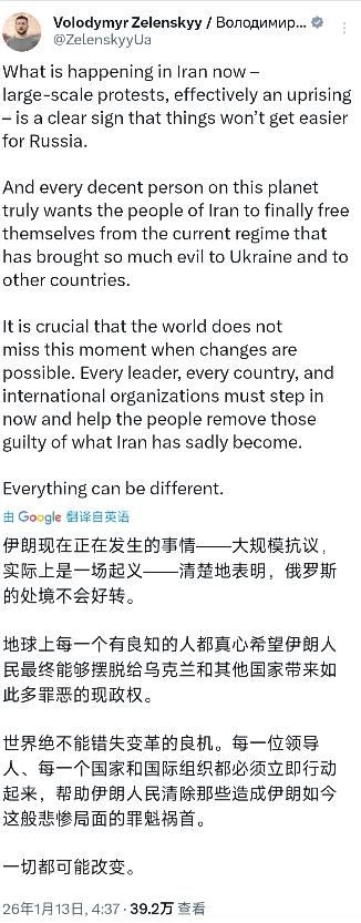 泽连斯基今天(北京时间1月13日)写道:“伊朗现在正在发生的事情大规模抗议,实际上是一场起义清楚地表明,俄罗斯的处境不会好转。地球上每一个有良知的人都真心希望伊朗人民最终能够摆脱给乌克兰和其他国家带来如此多罪恶的现政权。世界绝不能错失变革的良机。每一位领导人,每一个国家和国际组织都必须立即行动起来,帮助伊朗人民清除那些造成伊朗如今这般悲惨局面的罪魁祸首。一切都可能改变。” 泽连斯基这番话,核心是想把伊朗的内部抗议和俄罗斯绑在一起,借伊朗的事给俄罗斯施压。 他把伊朗的大规模抗议定义成起义,本质是想给这场内部事件贴上个“变革”的标签,再把伊朗现政权和“罪恶”挂钩。 而这“罪恶”特意点了乌克兰,就是想强化伊朗现政权是俄罗斯盟友、和乌克兰对立的印象。 毕竟俄乌冲突里,外界一直有消息说伊朗给俄罗斯提供了无人机等武器,泽连斯基这是在借题发挥,暗示俄伊是捆绑在一起的利益共同体。 他说伊朗的情况表明俄罗斯处境不会好转,逻辑很直接,就是想传递“敌人的盟友出事,敌人自己也好不了”的信号。 潜台词就是俄伊现在是抱团取暖,伊朗内部不稳,相当于俄罗斯少了一个可靠的助力,这对俄罗斯来说是雪上加霜。 泽连斯基呼吁有良知的人希望伊朗人民摆脱现政权,这话里带着明显的舆论引导,想争取国际社会对伊朗抗议活动的同情。 同时把伊朗现政权描述成“罪魁祸首”,也是为了给后续呼吁国际干预找借口,让国际社会觉得介入伊朗事务有合理性。 他强调世界不能错失变革良机,要求各国和国际组织立即行动,核心诉求还是想拉外部力量介入伊朗局势。 一旦国际社会真的对伊朗施压甚至干预,受影响最大的就是和伊朗有深度合作的俄罗斯,这才是泽连斯基真正的目的。 从俄乌冲突的大背景来看,泽连斯基现在很需要通过这种方式制造舆论声势,分散俄罗斯的注意力。 毕竟当前俄乌战场局势胶着,乌克兰在军事和援助上都面临压力,借伊朗的事炒作能争取更多国际关注和支持。 他想让国际社会形成“俄伊联盟危害世界”的认知,从而推动更多国家对俄伊采取强硬态度,甚至加大对乌克兰的援助。 而且泽连斯基特意强调“一切都可能改变”,也是在给外界传递一种预期,暗示伊朗现政权可能倒台,俄罗斯的处境会因此恶化。 这种预期能打击俄罗斯的士气,同时提升乌克兰支持者的信心,让那些犹豫是否援助乌克兰的国家更倾向于出手。 要知道俄伊一直保持着战略伙伴关系,在经济和军事领域都有合作,这对被西方制裁的俄罗斯来说很重要。 泽连斯基就是看准了这一点,才想通过炒作伊朗内部问题,破坏俄伊之间的合作基础,削弱俄罗斯的外部支撑。 他的这番言论,本质上是把伊朗局势当成了俄乌冲突的延伸战场,用舆论手段向俄罗斯及其盟友发起攻击。 通过将伊朗现政权塑造成“邪恶政权”,把俄罗斯和其绑定,从而在国际舆论场上孤立俄罗斯,为乌克兰争取更多主动。 这种借他国事务为自身冲突造势的做法,核心还是服务于乌克兰在俄乌冲突中的整体战略,希望通过国际舆论的施压改变战场态势。