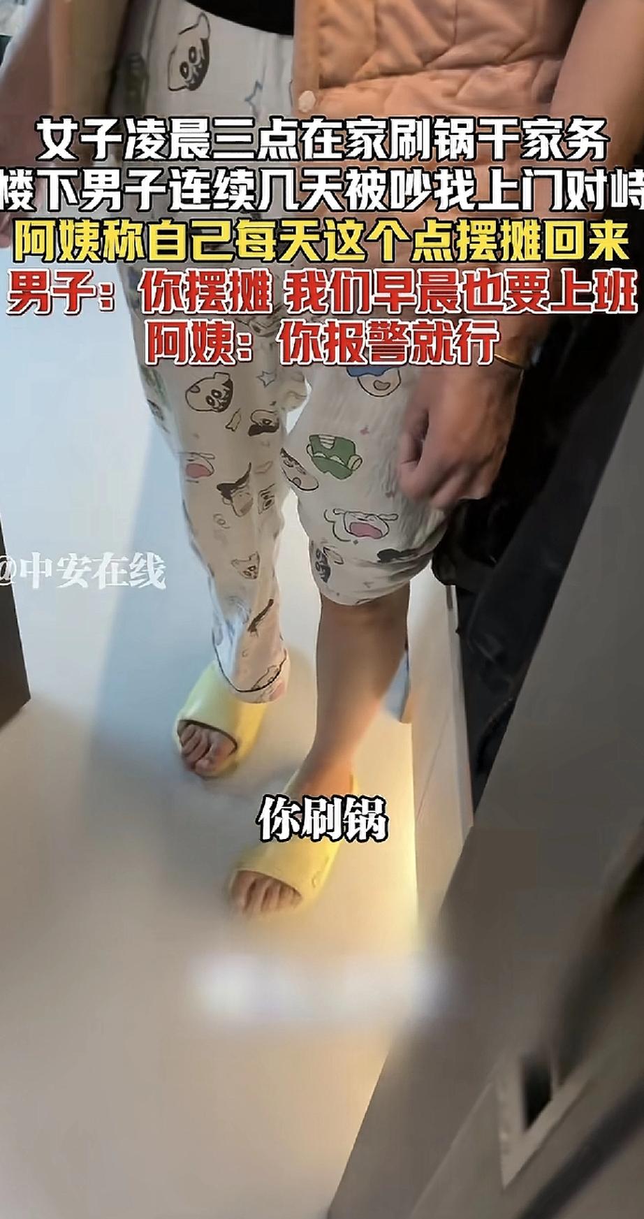 阿姨凌晨三点收摊回家,开始刷锅洗碗做家务。锅碗瓢盆的响声连续几天把楼下邻居吵醒,男子忍无可忍,凌晨找上门对峙。 男子说:“你摆摊辛苦,可我们一大早也要上班啊!”阿姨直接回了一句:“你报警就行。” 这话把沟通的路给堵死了。邻里纠纷,一个觉得理直气壮,一个觉得忍无可忍。其实双方各有不易,需要的是互相体谅和找到一个折中的办法,比如用软布垫着锅碗、尽量轻拿轻放。一句“你报警吧”,看似强硬,实则把简单问题推向了无解。