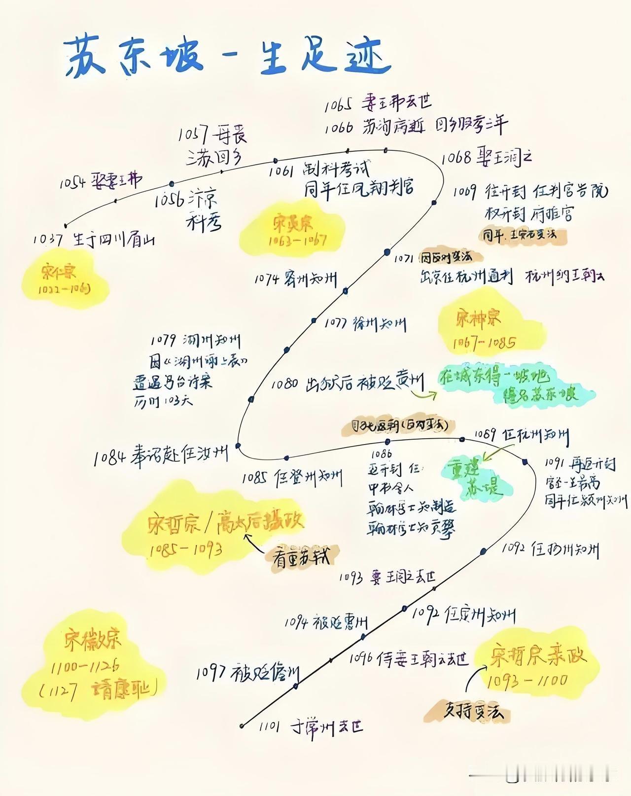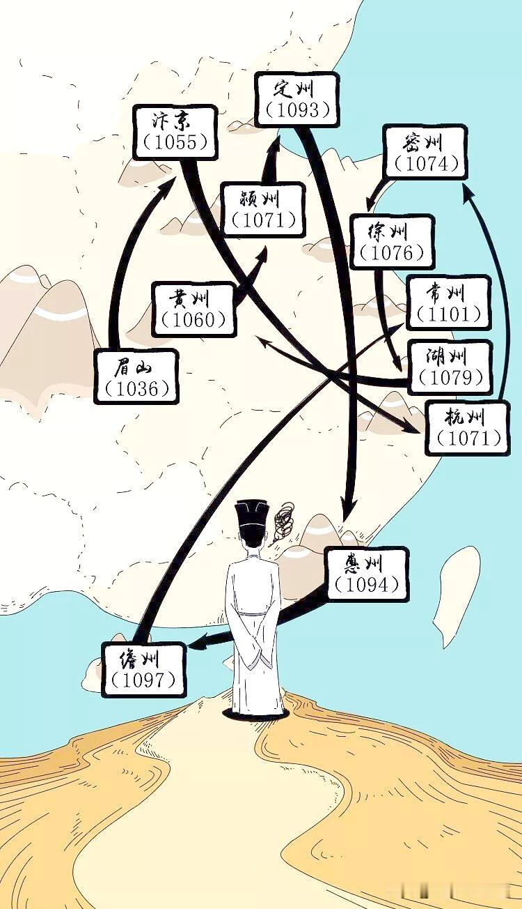 苏东坡的一生轨迹图 他一生走过多少路? 苏东坡活了64岁,却跋涉了10万多里路,从出川赶考到被贬天涯,其中有2800里蜀道风霜、有3700里三峡激流、还有黄州逆境中的诗情喷发,直至六千里孤舟北归。 他说:人生如逆旅,吾亦是行人! 如果从21岁出川赶考算起的话,苏轼累计有7年的时间奔波在旅途中。 酒酣胸胆尚开张,一蓑烟雨任平生。问汝平生功业,黄州惠州儋州。 苏东坡的智慧,豁达,值得后人学习...