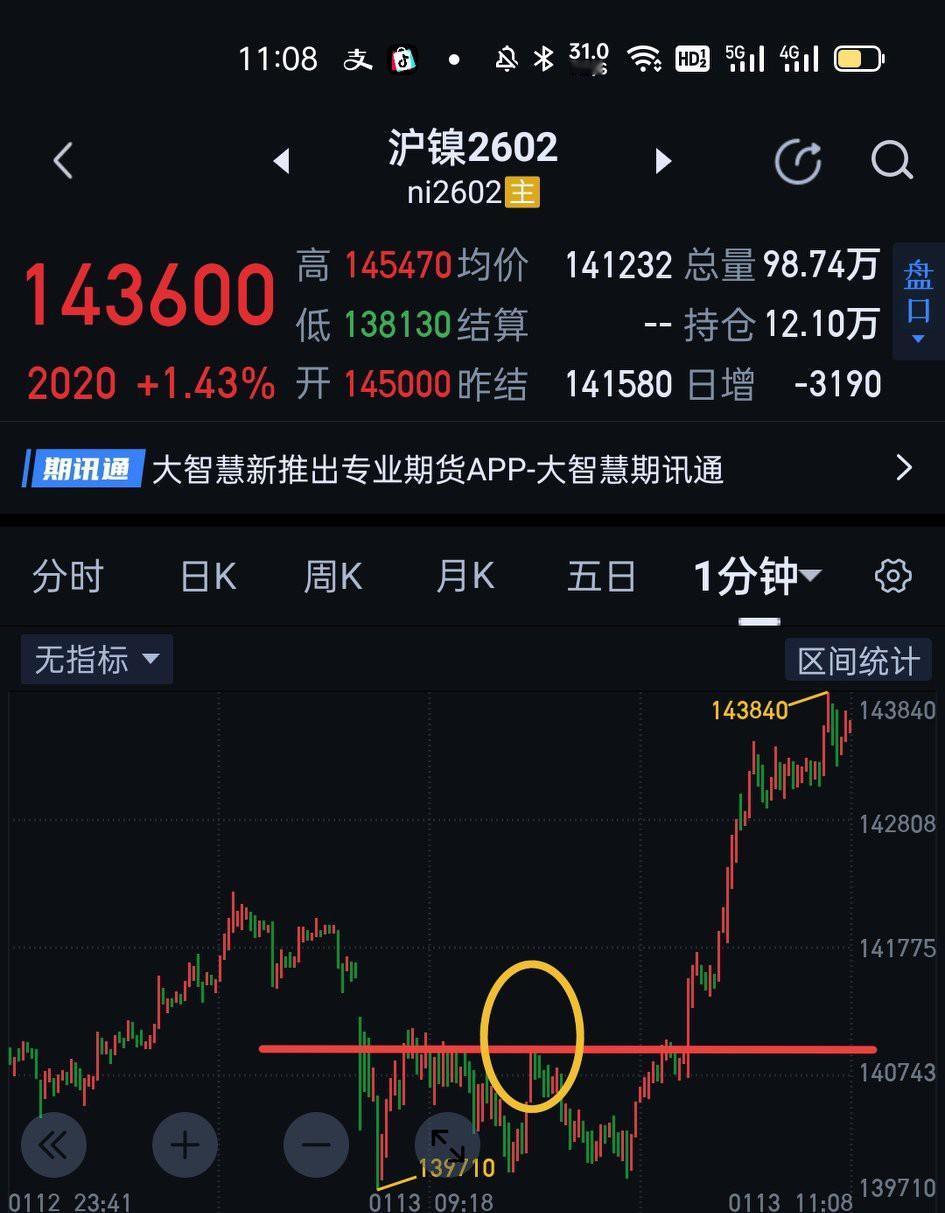 沪镍2602早盘的下跌动作最终止步于138130上方,导致5分钟的下降结构没有打开。后面如果回踩不再进入该中枢,就需转换为多头思维去跟随。具体思路下午收盘再续。上午9:45左右曾发文提示调整止损位,后因,第一没有阅读量,第二怕指导操作形成依赖,后删除了。操作一定要动态去跟,没有什么事是一劳永逸的。[微笑]