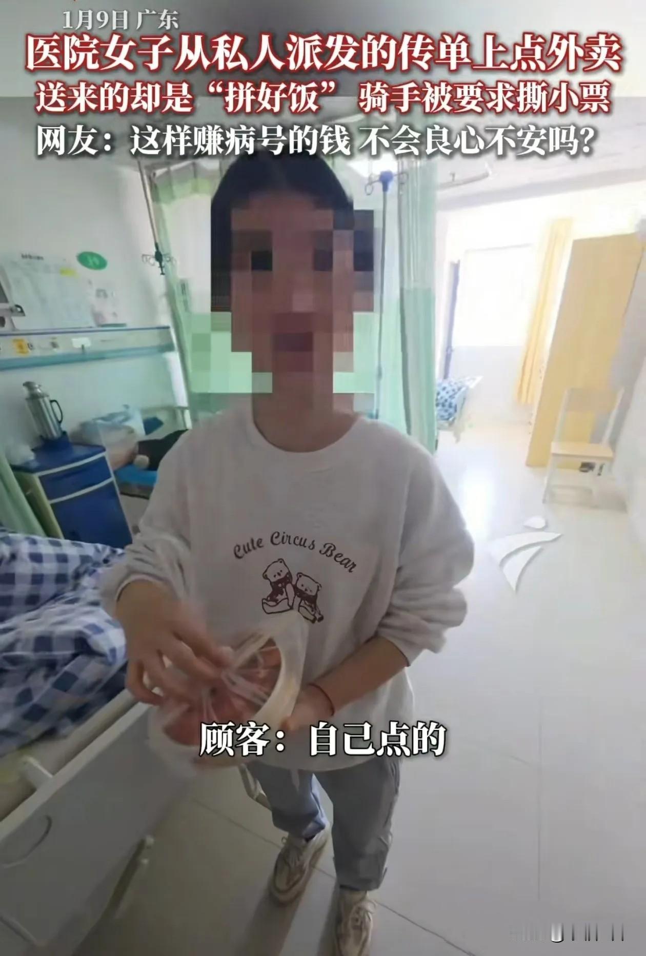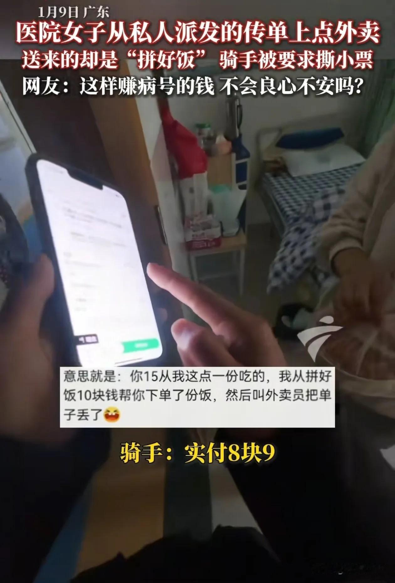 医院床头扫码点餐,15元竟变8.9元拼好饭? 广东女子陪家人住院,满心信任床头“官方点餐码”,花15元点份“医院营养餐”,等来的却是外卖小哥,这一幕让无数网友怒了!更让人寒心的是,外卖小哥无意间揭开内幕:这份饭在平台上是8.9元的拼好饭,订单还备注“必须撕毁小票、换掉外包装”,就为了掩盖差价骗局 。 生病住院本就是人生至暗时刻,病人要扛病痛,家属要操碎心,点份饭图的就是医院背书的卫生和营养。谁能想到,有人专盯这块“软肋”,把虚假二维码贴进病房,伪装成官方渠道坑钱。这些中间商吃透了患者心理:身体虚弱没精力核对,就算发现不对劲,也懒得折腾维权,干脆自认倒霉,于是大胆赚这6块多的黑心差价,据说有人靠这套路月入两万! 更可怕的是食品安全隐患。病人免疫力本就低下,医院食堂的餐食有严格的留样制度和营养标准,可这些低价拼好饭呢?不少是“幽灵外卖”出品,后厨油污结块,食材来源不明,甚至用反复加热的剩菜,健康人吃了都可能闹肚子,病人吃了岂不是雪上加霜?之前就有医生提醒,这类餐食细菌超标风险高,极易引发并发症,到时候责任谁来担? 这事里,中间商固然可恨,但医院的监管漏洞更让人揪心。病房是医疗管理区域,外来二维码能随意张贴,长时间无人清理,这难道不是给不法分子可乘之机?反观有些医院,把正规点餐码统一贴在床头屏,由营养科审核菜单,标注营养成分,护士还会核对送餐信息,同样是扫码点餐,差距怎么就这么大? 患者要的从来不多,不过是一份干净、透明、放心的饭。那些盯着救命钱的中间商,赚的每一分都是带血的利润。希望医院赶紧全面排查清理虚假二维码,把正规渠道显眼公示,也提醒各位家属:扫码前一定要看是否标注“医院官方”,遇到可疑情况及时找护士站反映 。 别让本就艰难的就医路,再遭“饮食刺客”暗算。你在医院遇到过类似的消费陷阱吗?欢迎在评论区分享经历,提醒更多人避坑!