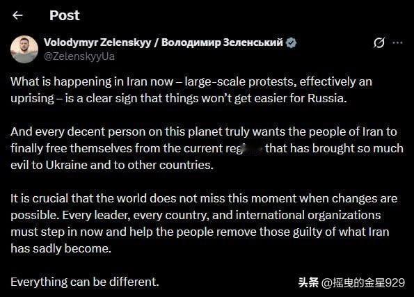 泽连斯基发文,提出建议,声称,世界应该对伊朗发生的大规模抗议活动做出反应,并呼吁,世界各国抓住机会,推翻伊朗政权。 泽连斯基说,“伊朗现在正在发生什么——大规模抗议,实质上这是一场起义” 与此同时,泽连斯基还不忘将伊朗与俄罗斯联系在一起,称:对俄罗斯来讲,局势并不会因此而变得轻松。 泽连斯基还表示,对于伊朗的抗议活动,世界上每一个“正直的人”都真心希望伊朗人民最终摆脱当前政权。 同时,泽连斯基强调,伊朗给乌克兰和世界其他国家带来了诸多的邪恶。至关重要的是,世界不能错过这个变革可能发生的时刻。 他还呼吁,世界上每一位领导人、每一个国家以及国际组织都必须立即行动起来,协助伊朗民众铲除那些导致伊朗不幸现状的罪魁祸首。蓄意推翻伊朗政权。 最后,泽连斯基还强调——这一切,皆有可能。