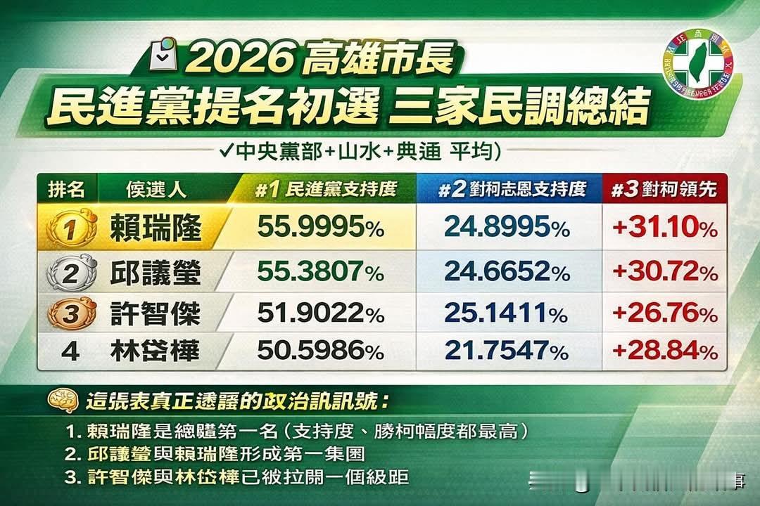 民进党高雄市长初选结果:不出意外!赖系赖瑞隆出线! 今天中午,民进党中央公布高雄市长民进党初选结果,果然如大家所料,赖清德子弟兵赖瑞隆出线!尽管他儿子爆出霸凌争议(虽然最后双方家长改口称是个人冲突)。原来民调第一的林岱桦因为得罪民进党中央,只能屈居老末了。 可叹可笑。