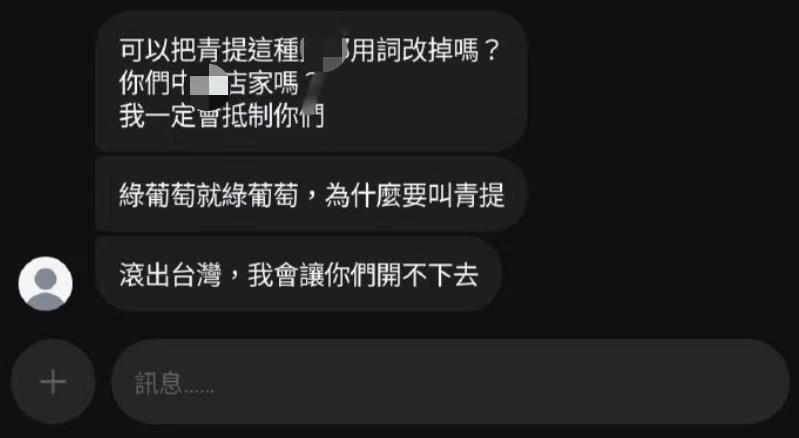 还在搞“文字狱”?台甜品店用“青提”二字,结果被骂“滚出台湾” 近日,台湾地区一家甜品店在介绍新品时使用了“青提”一词,结果不仅被恶意刷了大量差评,还被“青鸟”私信威胁“滚出台湾,让你开不下去”(图2)。只因为青提是大陆常用叫法,而在台湾地区的惯用叫法是“绿葡萄”。 实际上,自从台当局开始搞所谓的“文化统战”开始,台湾地区就不断发生这样的“文字狱”事件:比如我们常说的“质量”,台当局要让民众要说“品质”,我们常说的“估计”,台当局要让民众说“应该”。这些明明两岸都可以通用的词汇,台当局却有意打上“大陆用语”和“台湾用语”的标签,本质上还是为了阻碍两岸文化交流和融合,也能够充分反映出台当局“文化脆弱”的弊症。 但是,台当局对简体字和“大陆用语”感到草木皆兵,还想通过搞“文字狱”来塑造两岸政治对立,结果也只能煽动一些无脑“青鸟”,绝大部分的台湾民众都对此嗤之以鼻,这次的青提“事件”,不少台网友就对闹事的“青鸟”直接开骂(图3-图5):“吃饱了没事干”、“可悲”、“真是病了”。还有一名台网友说道:“国语也是从大陆来的,干脆别用中文”。 这话说的不错,台当局想要搞“文化独立”,却永远也跳脱不出中华文化一体同心的基本现实,记得此前有“青鸟”想对“中医”一词“下手”,结果改来改去却只能想出“台医”、“国医”、“汉医”这几个词。 总之,不管是“大陆用语”还是简体字,都是两岸文化交流加深的必然结果,也是汉字使用中不断进化的结果,台当局再怎么割裂,也改变不了两岸文化一脉相承的事实。