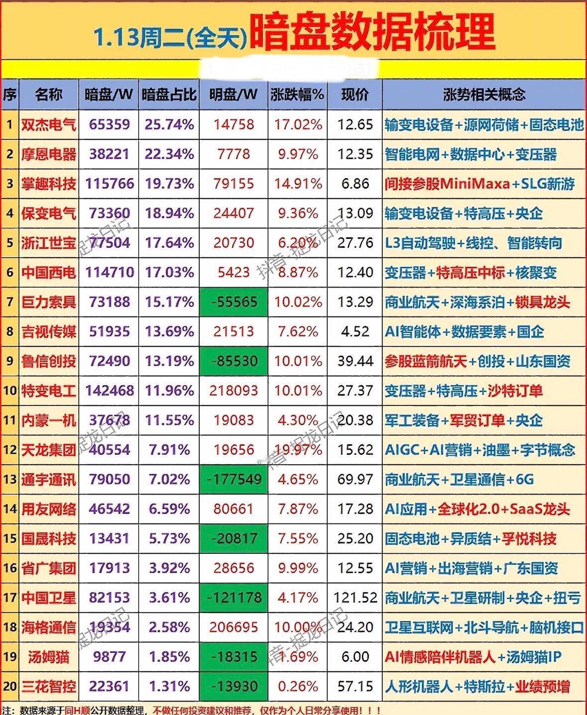 1.13周二暗盘数据梳理,揭秘涨势相关概念!📈📊 "电力设备领涨,特高压、固态电池概念活跃;商业航天与AI应用受关注,个股分化明显。"