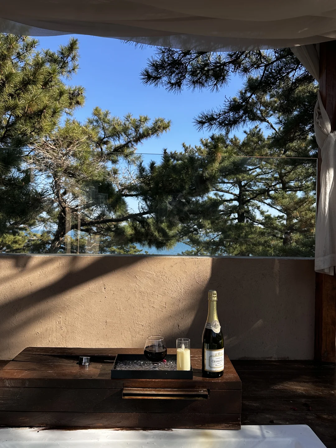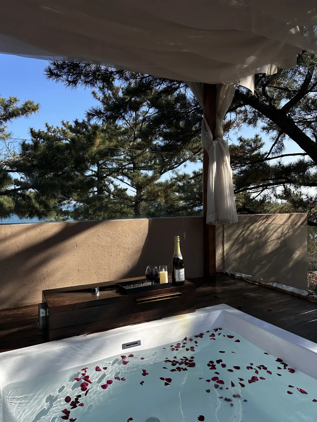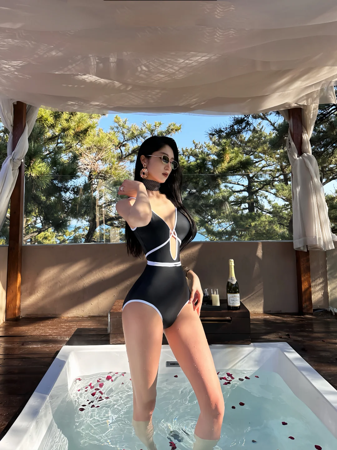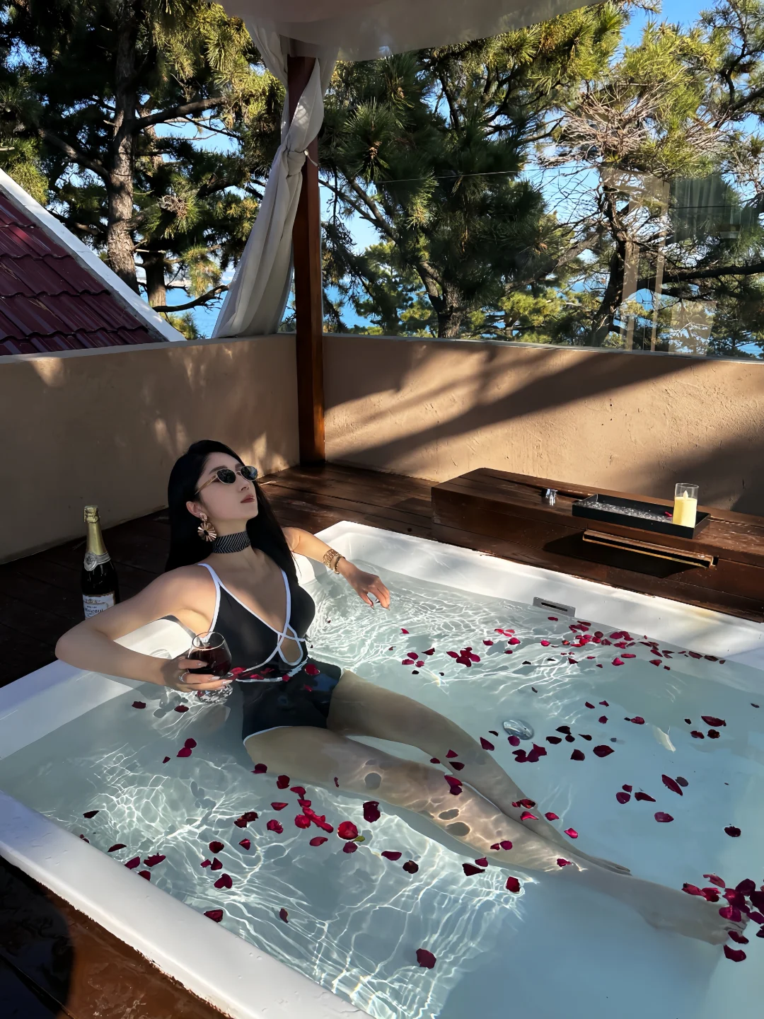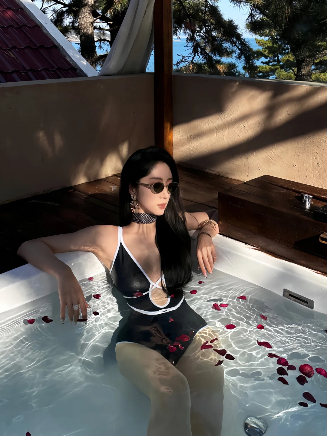 趁休息日来崂山度个假 没想到冬天的崂山没想到这么美 果然天冷的时候就应该泡在汤泉里~ 换好泳衣后 朋友说我很像8090年代的复古海报女郎 绑带设计好特别~
