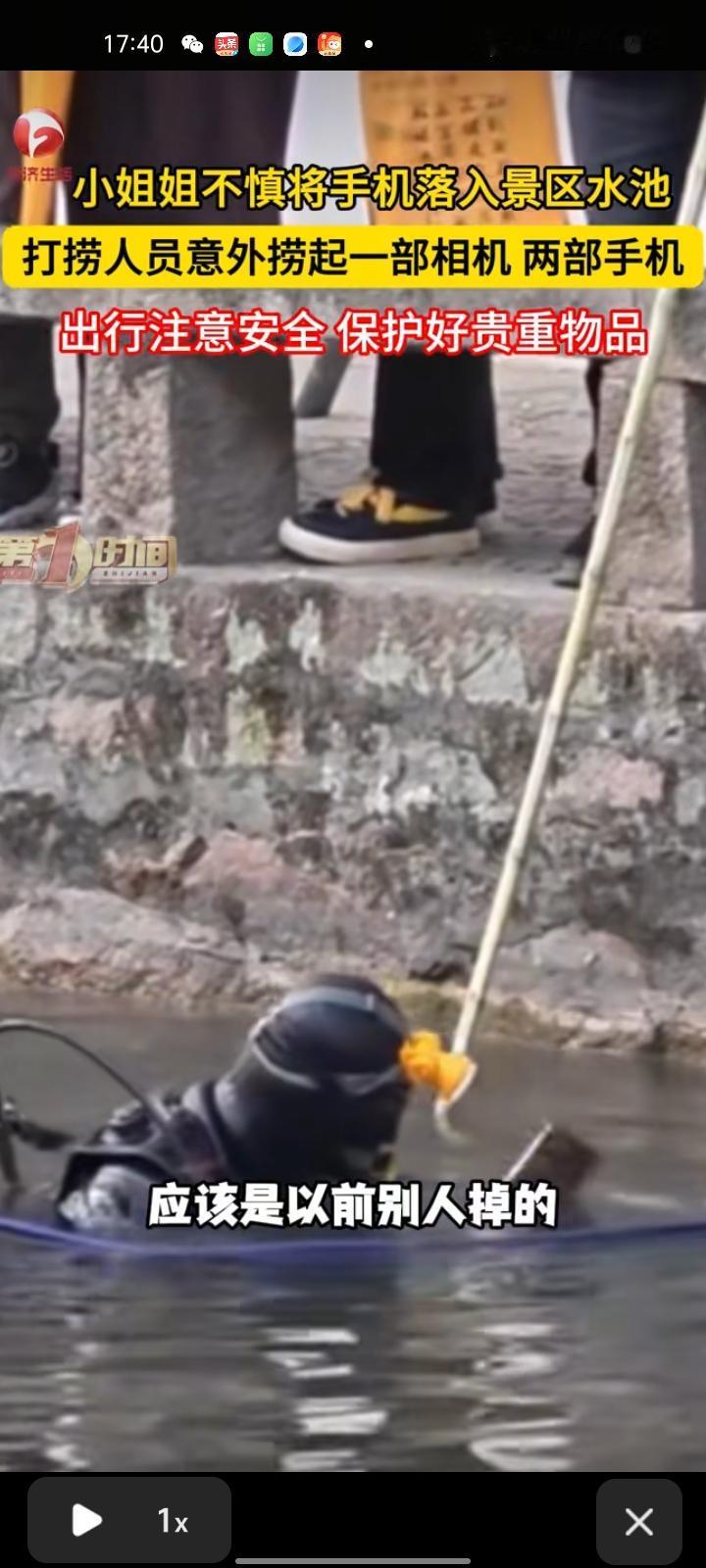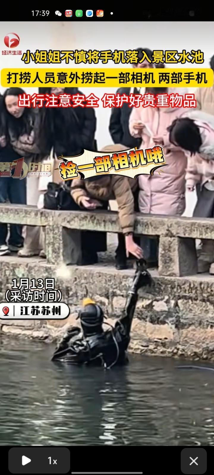 1月11日,江苏苏州。网友发视频表示,自己在西园寺游玩时,有位小姐姐的手机掉进池子里了,打捞人员下水意外捞起一部相机、两部手机,应该是以前别人掉的,最后才捞出她的手机,确认并还给了她。至于一部相机和两部手机如何处理,自己不得而知。