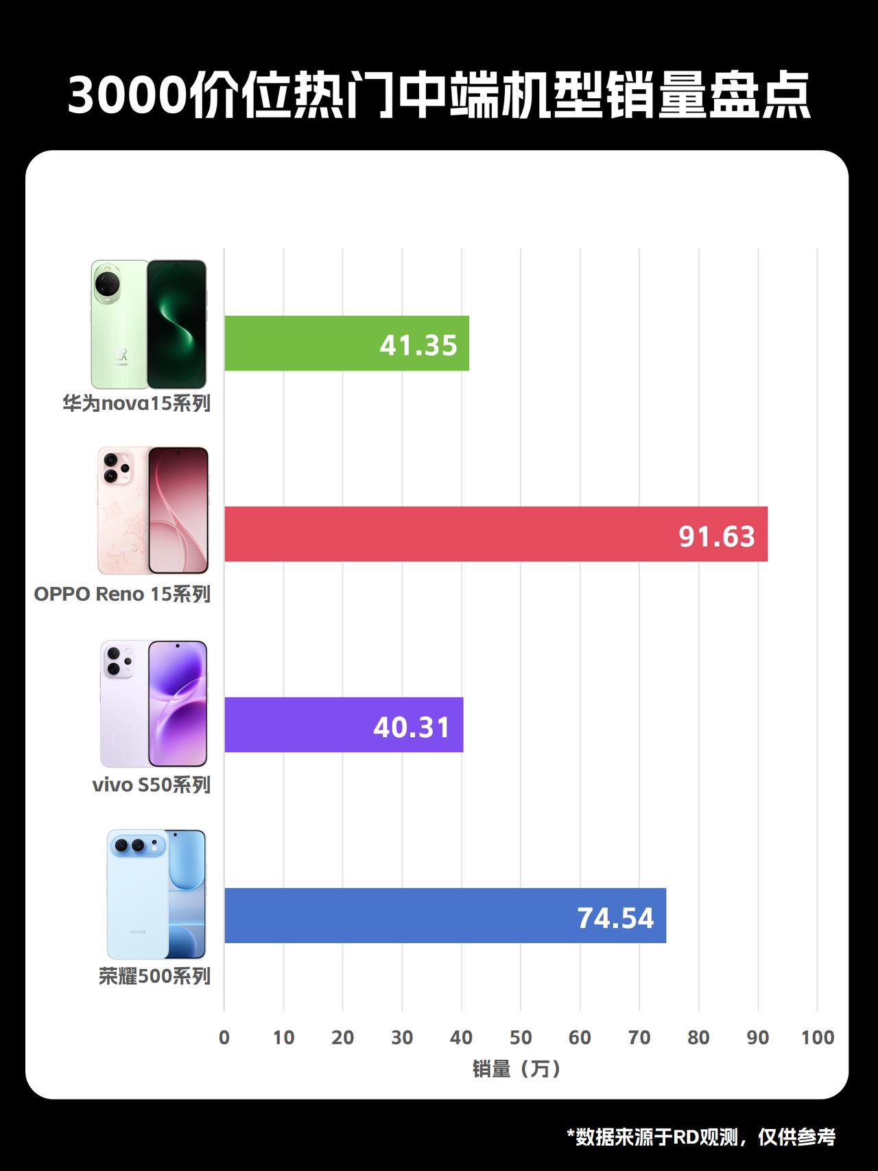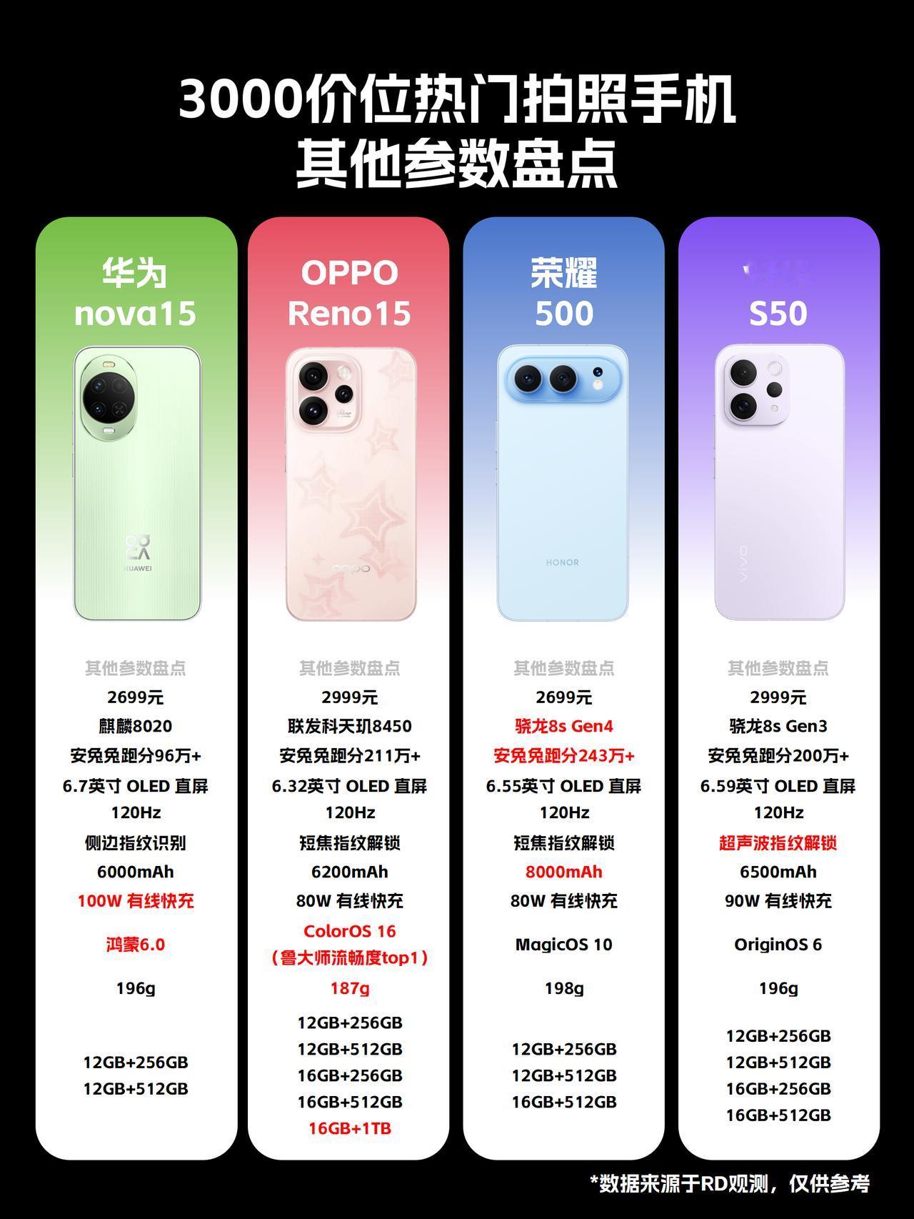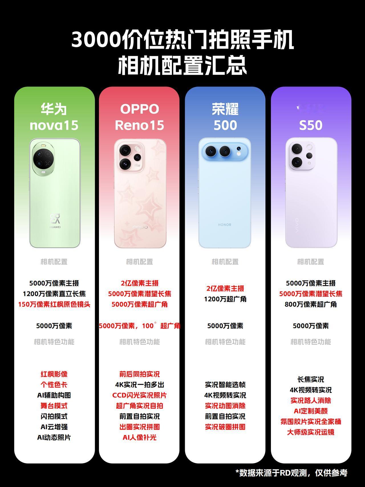 3000价位拍照手机销量汇总!过年换机就选他们 颜值高+拍照好看,✨在中端市场果然很吃香!! 最近,RD观测盘点了3000元档几款热门中端机的销售表现,没想到各家都卖这么好 ps:各款机型的上市时间差异很大,不能单看销量成绩🔥! -- OPPO Reno15系列(开售时间11月21日):目前已卖出91.63万台; 荣耀500系列(开售时间11月28日):目前已卖出74.54万台; 华为nova 15系列(开售时间12月25日):目前已卖出41.35万台; vivo S50系列(开售时间12月19日):目前已卖出40.31万台; -- 🌺各自配置亮点: 1️⃣ OPPO Reno15影像配置拉满,2亿主摄+5000万潜望长焦+5000万超广角,无凑数镜头,而且实况玩法比其他三款都多:前后同拍、CCD 闪光实况、4K 实况一拍多出、支持多主体出圈的实况拼图功能。ColorOS 16系统丝滑流畅,还有各种超实用AI功能。 -- 2️⃣荣耀500系列后置双摄,2亿主摄+1200 万超广角,无长焦远景拍摄差点意思。🔋8000mAh电池,续航无忧。 -- 3️⃣ 华为nova15主打红枫原色影像,还有个性色卡玩法,色彩还原会更精准,而且支持北斗卫星图片消息。 -- 4️⃣vivo S50为5000万主摄+5000万潜望长焦主流镜头,还有800万超广角也够用,主打长焦live,拍人像很有氛围感,支持超声波指纹解锁。 -- 如果过年想买一台拍照好的机型,不妨看看这几款国补3000左右的手机。 与其纠结参数,不如从这些热销型号里,挑最符合自己拍照习惯的那一台,反而更不容易踩雷😄。 国补3000左右手机 3000元手机推荐 OPPOReno15 荣耀500 vivoS50 华为nova15 拍照手机 春节换新机