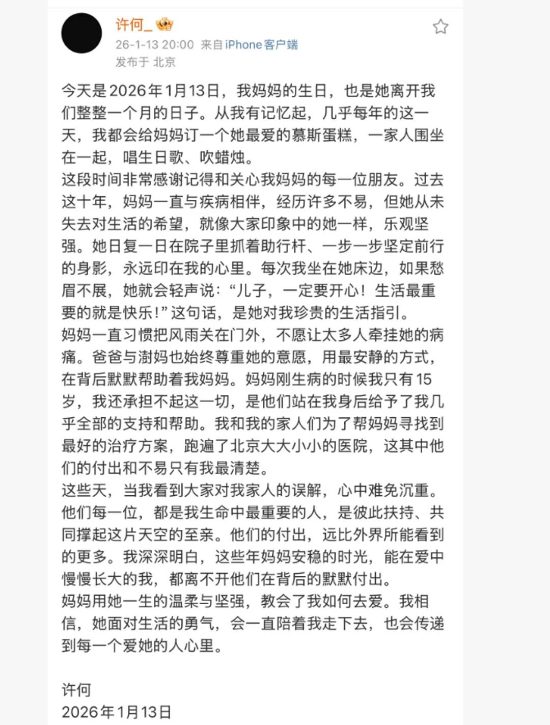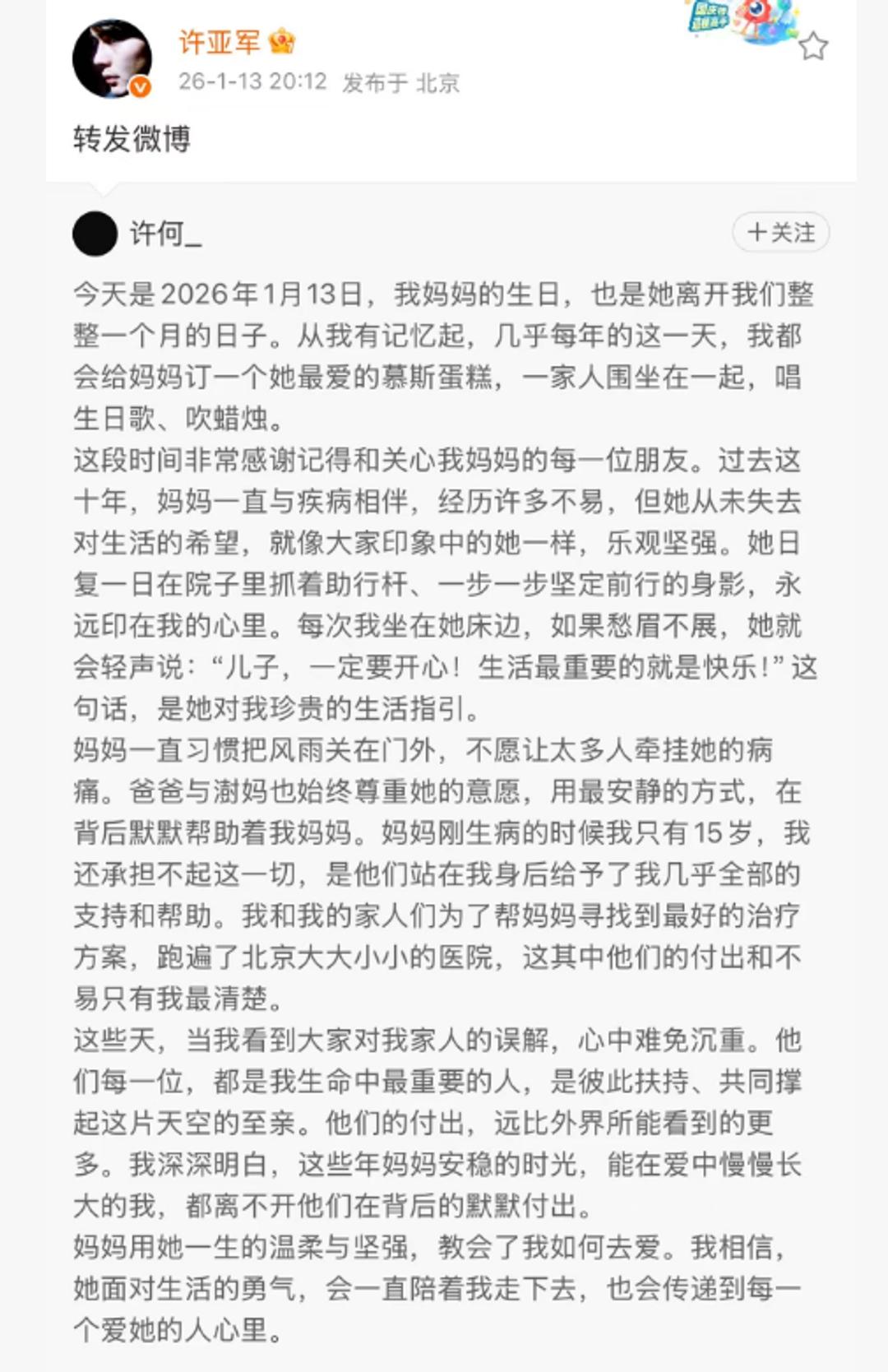 2025年12月13日,北京初雪,演员何晴的告别式上,24岁的儿子许何独自捧着骨灰盒,身影孤单。他的父亲、演员许亚军,因身在美国未能到场。 一时间,网络炸锅。许亚军连同现任妻子张澍,被推上风口浪尖。人们指责他薄情,翻出过往情史,骂声不绝。 张澍的社交账号也被迫关闭评论。表面看,这像极了一场“缺席的父亲”与“隐忍的儿子”的故事。 直到2026年1月13日,何晴冥诞,许何的一篇长文让事情彻底反转。 他写道,母亲患病的十年间,父亲和“澍妈”张澍,始终是背后最坚定的支持者。他们为寻医问药四处奔走,承担了高昂的治疗费用,更在许何15岁那年母亲刚病倒时,给了他全部依靠。 许何称他们为“生命中最重要的人”。他还透露,母亲生前与张澍关系融洽,常有来往。 我们这才明白,镜头之外,是长达十年的默默付出与体面成全。何晴不愿以病痛示人,许亚军与张澍便选择以最安静的方式支持。没有公开辩解,只有孩子心里最清楚的账。 许亚军最终转发了儿子的文章,未置一词。一切尽在不言中。 这事像个巴掌,拍醒了不少看客。我们总爱凭着碎片信息仓促审判,却常常忽略了生活复杂的褶皱与人情温暖的暗线。 有时候,沉默不是冷漠,而是对当事人意愿最大的尊重;体面,远比公开表演深情更为艰难,也更为珍贵。