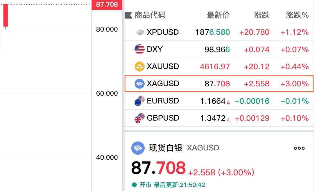 现货白银价格突破87.7美元, 毫无意外再创新高,涨幅3%。 现货白银报价87.708美元, 较上一日上涨2.558美元, 距离传说中100美元越来越近! 对于白银来说, 近期就是欢乐的海洋, 不断上涨,您持有白银?