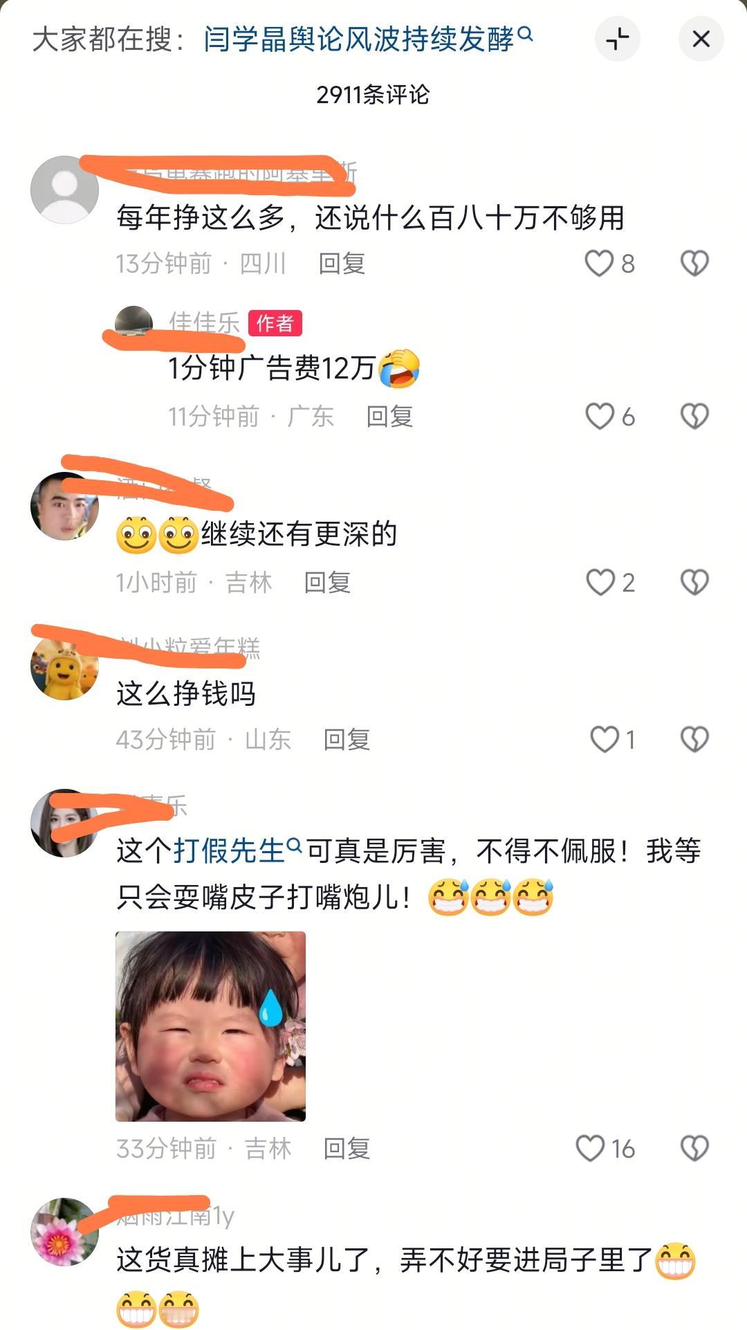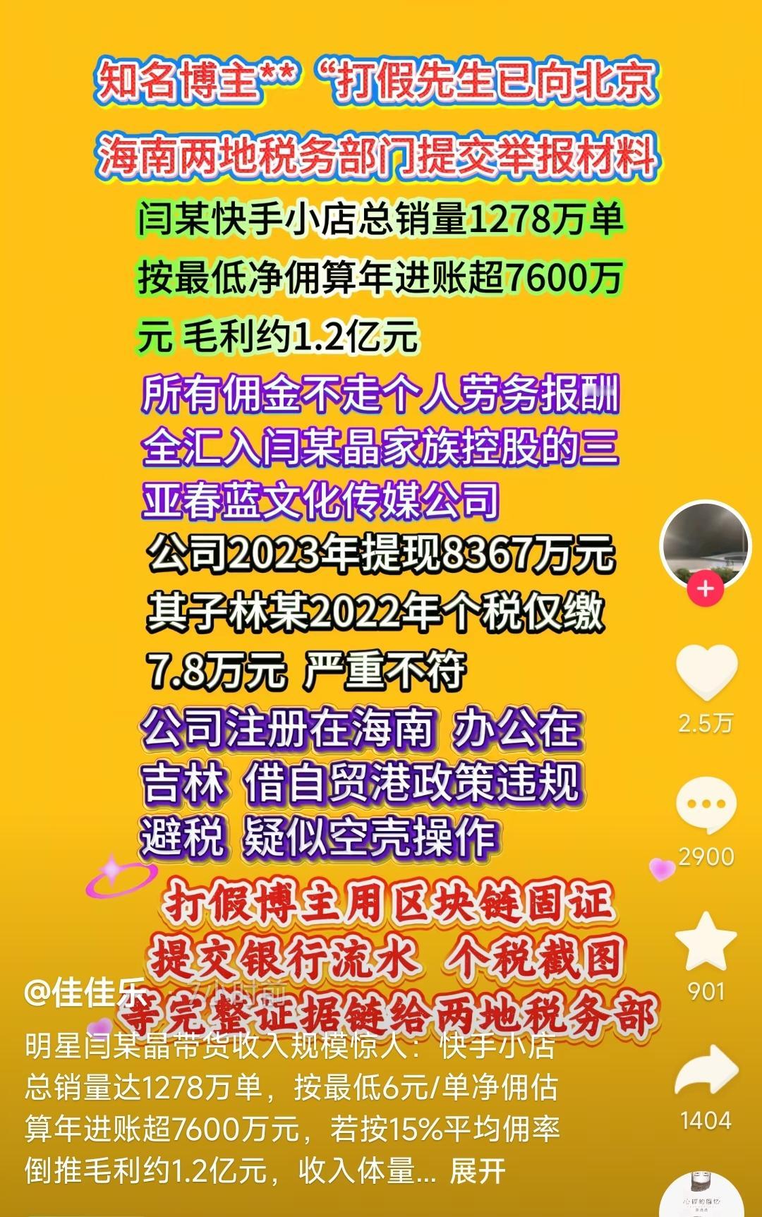 闫学晶又摊上事了。 自从她道歉之后,我本来以为事情就过去了。 没想到网上突然有一个叫打假先生的网友,直接举报闫学晶税务问题。 说闫学晶在网上的店铺销量过万,毛利率超过一个亿,但是所有运营均不走个人劳务报酬,而是转入了家族控股的传媒公司。 然后公司提现了8000多万,但是他儿子个人所得税仅交7万多。 明明公司在海南,但是却在东北办公,涉嫌空壳操作,违规避税。 如果说之前闫学晶口无遮拦是道德问题,那么这次的税务问题,闫学晶该怎么接招呢?