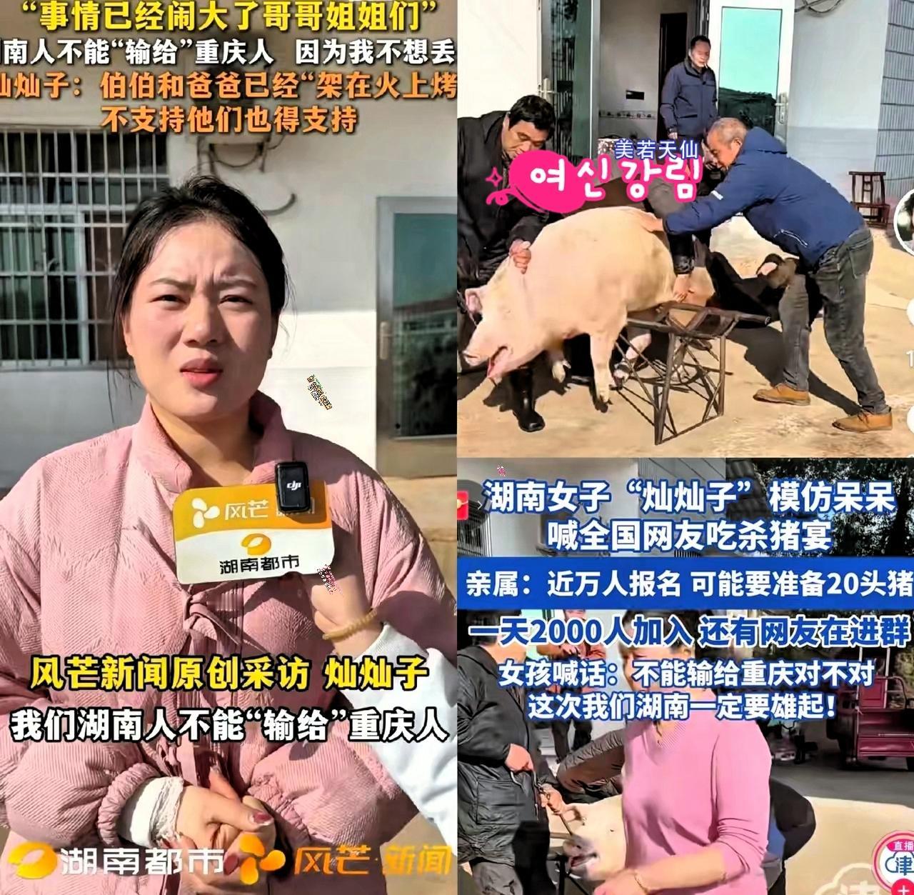 这回事情闹大了! 湖南灿灿太倔强, 为了不输给重庆呆呆,19头猪100张桌子已就位,她还说服了父亲和伯伯。 ​只为了不输给重庆,湖南灿灿家直接把原定5天后的刨猪宴提前,就为招待奔着这一口的粉丝! 灿灿说湖南鲜辣爽PK重庆麻辣香,没有重麻红油的纯粹鲜醇更让人难忘,这份实在劲儿难怪能接住泼天流量。更圈粉的是她主动报备相关部门,连网络和交通都提前安排妥当,不搞虚头巴脑的套路。其实大家疯抢的哪里是一碗刨猪汤,分明是久违的乡土烟火气和人与人之间的真诚热络。这场民俗狂欢告诉我们,流量从来不是偶然,接地气的真诚和满满的诚意,才是最顶流的密码,这样的乡村盛宴谁能不爱?