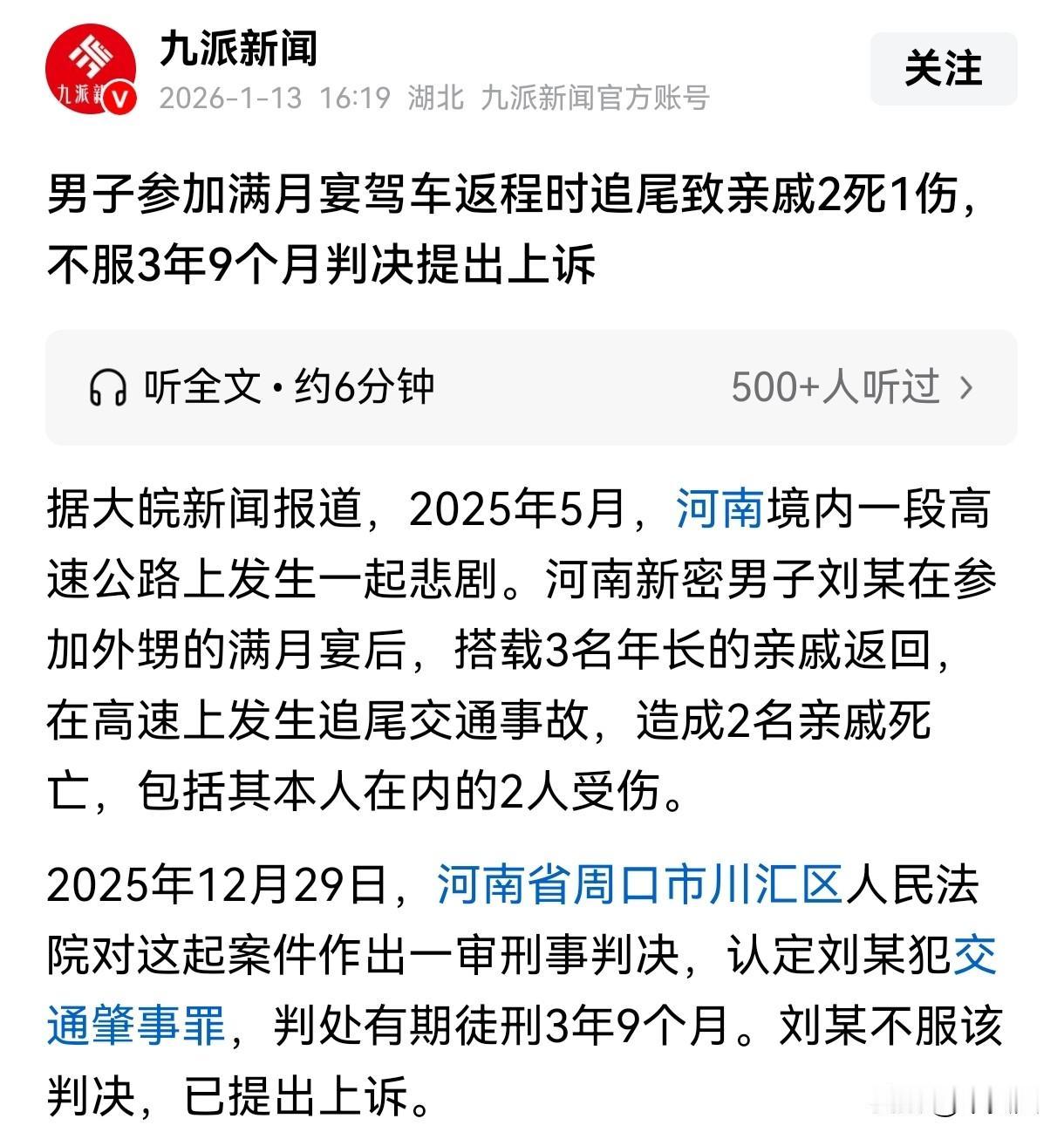 河南新密,男子参加完外甥满月宴后开车回家,车里搭载了3名年长的亲戚,男子看手机导航,追尾前方作业车,发生惨烈事故,造成2名亲戚死亡,其本人和另一亲戚受伤。事后,亲戚家属从保险公司各获赔60万,男子一家出了丧葬费,可亲戚家属始终无法原谅男子,男子因交通肇事罪获刑3年9个月,男子不服,提起了上诉。 2025年5月18日,刘某和继父张先生等一众亲戚参加完外甥的满月宴,打算开车回家。 刘某的车里,副驾驶坐着张先生的父亲,后排分别坐着张先生的姨父邢先生和舅舅齐先生。 原本这只是一次普通的走亲访友,刘某开车出发后,张先生也开着车,跟在他们后面。 当天下午3点19分,刘某在高速公路上,查看手机导航时,不慎追尾了前方一辆轻型非载货专项作业车。 巨大的冲击力让车辆瞬间失控,两车又刮擦到了高速公路边的护栏。 刘某驾驶的车辆车头严重变形,刘某和张先生的父亲受伤,邢先生当场死亡,齐先生虽然被紧急送往医院抢救,但最终还是因伤势过重,抢救无效死亡。 原本欢欢喜喜参加满月宴的亲戚,陷入了巨大的悲痛之中。 经调查,事故原因是刘某驾驶过程中超速驾驶(他当时的车速是126公里每小时),分心驾驶、没有与前车保持安全距离,导致事故发生,刘某承担事故的主要责任。 前方专项作业车,当时的时速是46公里每小时,根据相关规定,在高速公路上行驶的机动车时速不得低于60公里每小时,师某驾驶机动车以低于规定速度行驶,承担事故的次要责任。 在事故的后续处理中,两名死者的家属从保险公司各获得了60万元的赔偿,张先生一家也承担了他们的丧葬费用。 可让张先生一家感到意外的是,对方并没有给刘某出具谅解书,双方就赔偿问题也没有达成一致。 邢先生和齐先生搭载刘某的车辆,并未支付任何费用,刘某搭载老人是基于亲戚情谊,符合“好意同乘”的构成要件。 《民法典》第1217条规定:非营运机动车发生交通事故造成无偿搭乘人损害,属于该机动车一方责任的,应当减轻其赔偿责任,但是机动车使用人有故意或者重大过失的除外。 刘某作为驾驶人,免费搭载他人,其行为属于“好意同乘”,应当减轻其赔偿责任,法院酌定减免了刘某20%的赔偿责任。 对于这个民事赔偿结果,邢先生和齐先生的家属无法接受。 齐先生的儿子表示事情发生后,他都快抑郁了。 因刘某的一个疏忽,毁了两家人,现在人没了,他们肯定要精神赔偿的,自己也可以一毛钱不要,只要刘某把人还给他们就可以了。 张先生也称对方就是不谅解,始终不谅解,人家也不多要,也不少要,反正就这么多钱,不给就达不成谅解。 有人说大家都是亲戚关系,既然事情发生了,好好沟通,积极赔偿,争取能谅解的就谅解吧。 即使是好意搭乘,也要好好开车,一点疏忽都不能有的,真出了事,就得赔偿。 除了民事赔偿责任,刘某还需承担刑事责任。 《刑法》第133条规定:违反交通运输管理法规,因而发生重大事故,致人重伤、死亡或者使公私财产遭受重大损失的,处三年以下有期徒刑或者拘役;交通运输肇事后逃逸或者有其他特别恶劣情节的,处三年以上七年以下有期徒刑。 刘某因违反交通运输管理法规,发生了致2 人死亡、2 人受伤的交通事故,并且负担事故的主要责任,其行为构成交通肇事罪,且属于有其他特别恶劣情节。 事故发生后,刘某并未及时报警,或保护现场、抢救伤者,也不存在明知他人报警而在现场等待的情形,所以不能认定为自首。 在量刑时,未获得2名死者家属的谅解,也是一个重要的考量因素。 最终,一审法院判决刘某犯交通肇事罪,判处其有期徒刑3年9个月。 刘某不服,已经提起了上诉。 据张先生回忆,事故发生后,继子刘某嘴巴被撞烂,手机也不知去向,整个人都处于懵了的状态,当时车门也打不开,他没机会也没能力报警求助。 这场悲剧对于死者家属而言,他们失去了亲人,这种痛苦是无法用金钱来衡量的。 而对于刘某来说,他肯定也陷入了深深的自责和悔恨之中,他或许也不想发生这样的事情,但一时的大意却酿成了大祸。 这场悲剧值得警醒,在驾驶过程中一定要严格遵守交通规则,集中注意力,切不可分心驾驶。 一个小疏忽,都可能引发不可挽回的悲剧,毁掉几个家庭的幸福,可能就变成会好心办坏事。 关注@木头人 ,从法律角度看世界,感受不一样的人情冷暖。