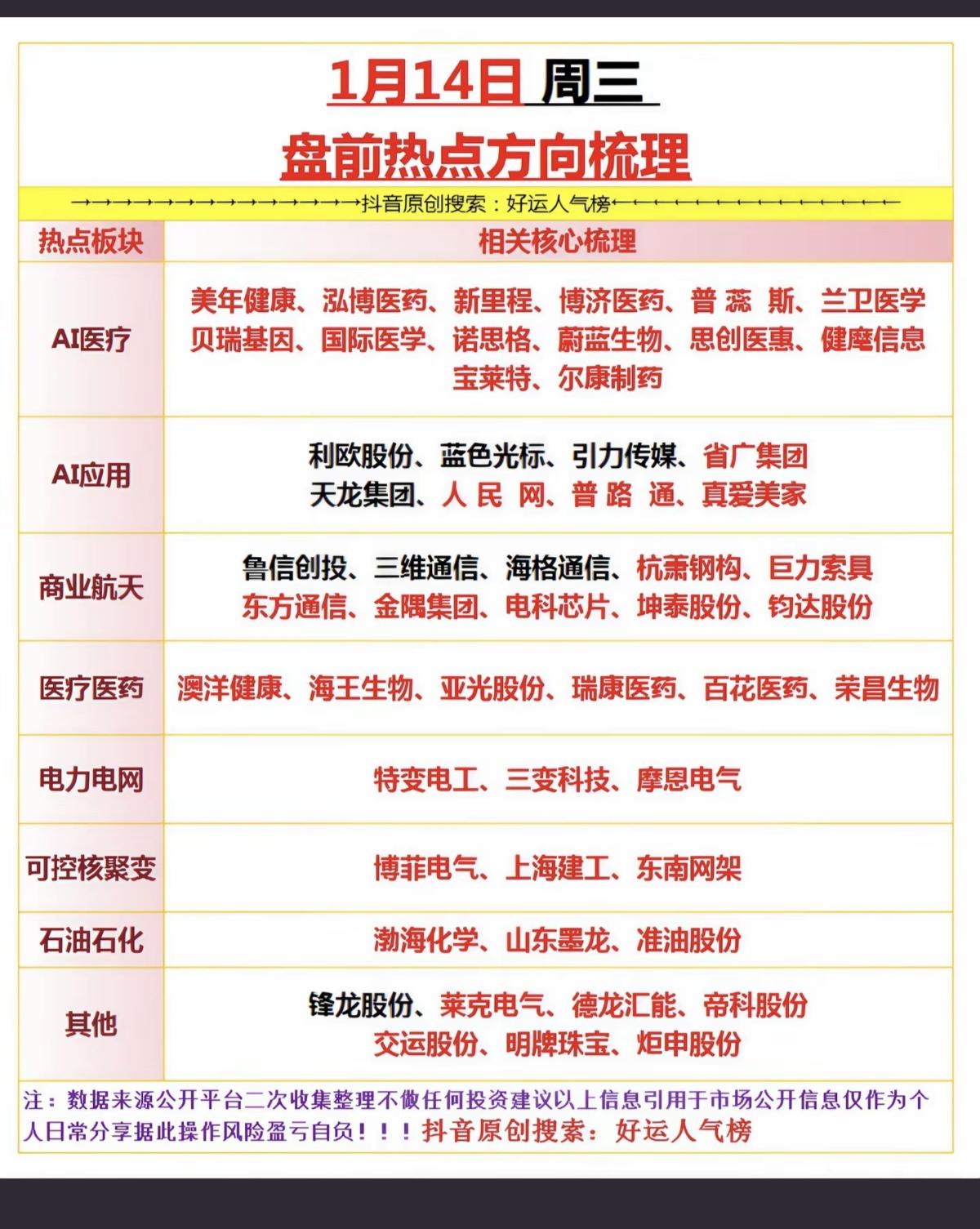 1.13周三 市场热点+投资方向! 1.智能体AI,AI应用,AI医疗 2.电力电网 3.商业航天,脑机接口 4.油气开采相关 5.可控核聚变