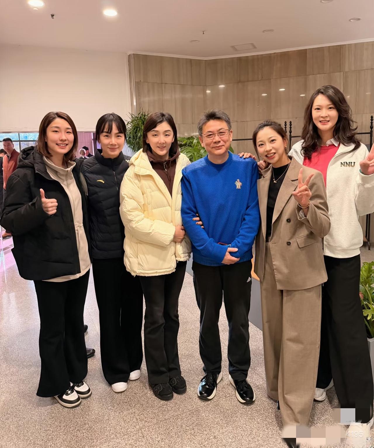 蔡斌与五位弟子齐亮相:波浪发垂肩的惠若琪盛颜仙姿,殷娜喜容绽放,刘梦雅眉眼含笑,王男龙眉凤目,王茜清雅端丽,或许是对中国女排情有独钟吧,总觉得金花们每次出镜都是一道最夺目的风景哈!