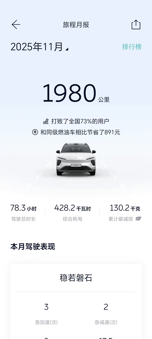 11月开了1980公里 这一个月换电差不多5次,一次换电费用大约在50元以内,还可以使用买车的送的加电补贴进行结算,每次换电后电量为93%,一般续航里程在300公里左右!能耗感受是下雨天很高,一是打开湿地模式,另外就是冬天天气寒冷也影响续航,不过上海换电站挺多,没有补能的焦虑。