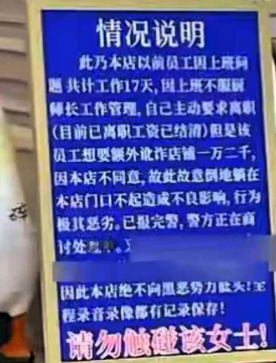 碰到狠人了! 近日,河南商丘一餐馆门前,一大姐躺地上用帽子盖头,躺4天了,路过的行人纷纷驻足议论,不少人都觉得纳闷又费解。 一开始大家还以为是餐厅搞行为艺术博眼球,毕竟大冬天的,地面冰凉,躺在上面肯定不好受。直到看到店家立在旁边的牌子,才知道这是一场劳资纠纷。这位大姐此前在店里干了17天,因为工作上不服从管理,主动提出了辞职,店家也按规矩把她的工资一分不少结清了。 谁料大姐辞职后突然变卦,向店家索要1万2千元赔偿金,双方几次协商都没谈拢。大姐二话不说,直接往餐馆门口一躺,不管店家怎么好言相劝,她都不吭声、不起身。 店家实在没辙,只能立牌详细说明情况,末尾还特意用大字标注“请勿触碰该女士”,同时第一时间报了警。目前相关部门和大姐多次沟通,可她始终不为所动,店家也没有更好的解决办法。 这事儿真的让人挺无语的,维权本是公民的正当权利,但得走正规途径。如果大姐觉得自身权益受损,完全可以收集证据,找劳动部门申请仲裁,或者通过法律诉讼解决,哪能靠堵门躺地的方式撒泼耍赖? 更关键的是,这种行为已经涉嫌扰乱公共场所秩序,店家的正常生意被严重影响,客人不敢进门,营业额大幅下滑,平白无故蒙受损失。耍无赖或许能暂时僵持,可根本解决不了问题,最后不仅丢了体面,还可能面临治安处罚,实在得不偿失。