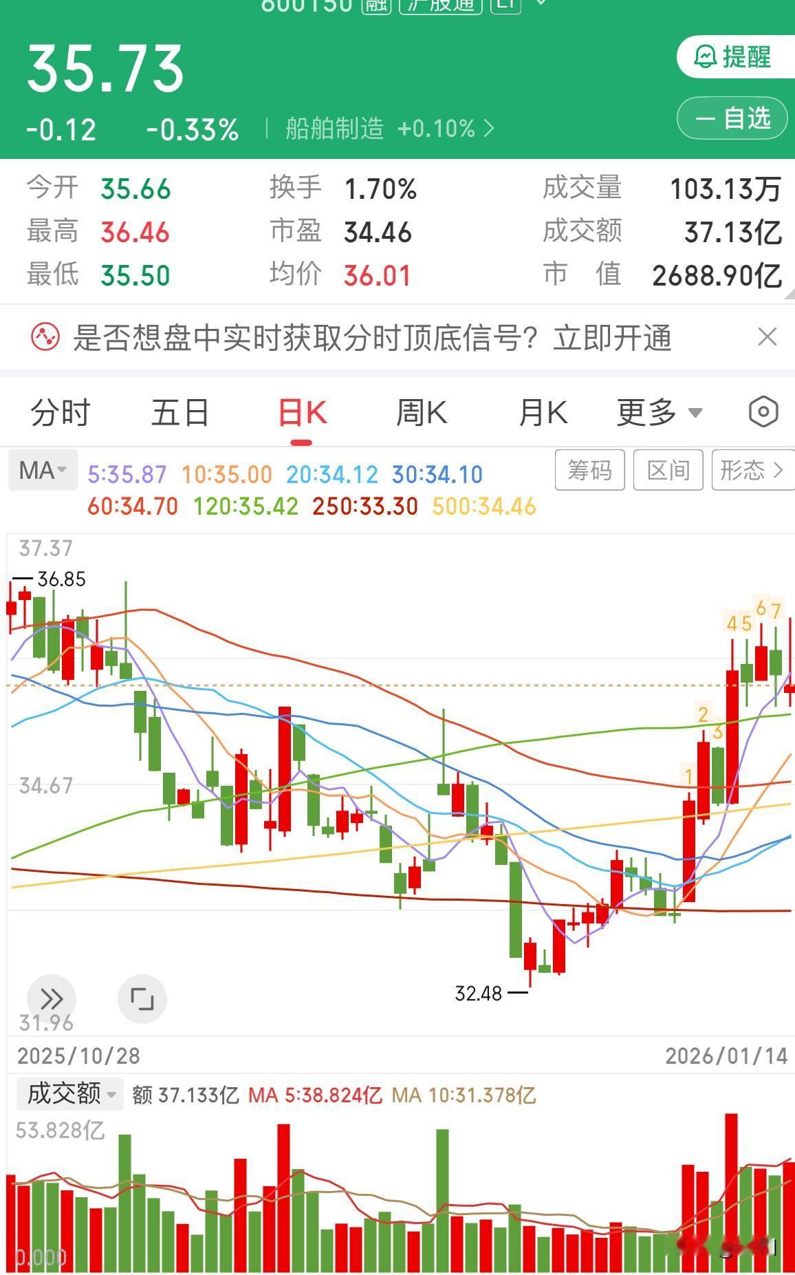 船舶明日是否会回调 今日船舶表现较为强势,虽呈微跌态势,K线为假阳真阴,依旧延续了近几日一阴一阳的走势规律。 关键在于后续走向,当前所处位置颇为尴尬。K线收出上影线,且已跌破5日线,KDJ指标明日便将在高位形成死叉。从技术面来看,预示着行情要进行调整;然而资金面上,主力资金持续流入,外盘始终大于内盘,显示买入的主力资金均持乐观态度。并且从量能方面分析,近期红柱多绿柱少,周线明显放量。这都表明机构仍在吸筹。 因此,即便明日出现调整,幅度也不会很大。长线投资者仍可坚定持有。
