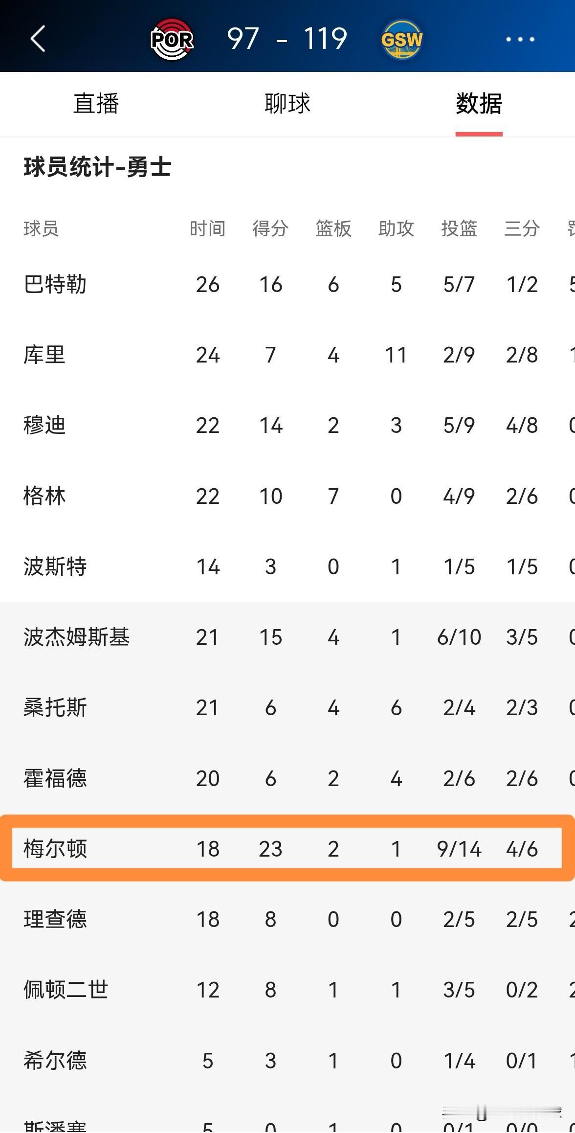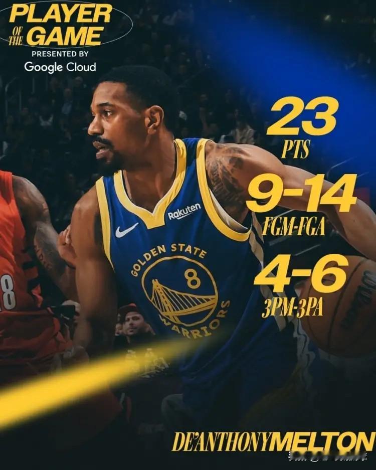 勇士大将梅尔顿终于被重视了!在今天勇士主场以119:97大胜开拓者的比赛中,梅尔顿在短短的18分钟里非常高效的砍下23分2篮板1助攻,成为了球队获胜的大功臣。在比赛结束以后,勇士官方在社媒上评选出了本场比赛的最佳球员,结果梅尔顿成功当选。 实事求是的说,以梅尔顿在本场比赛中的出色表现来看,他的当选是毫无争议的,他完全配得上这份殊荣。