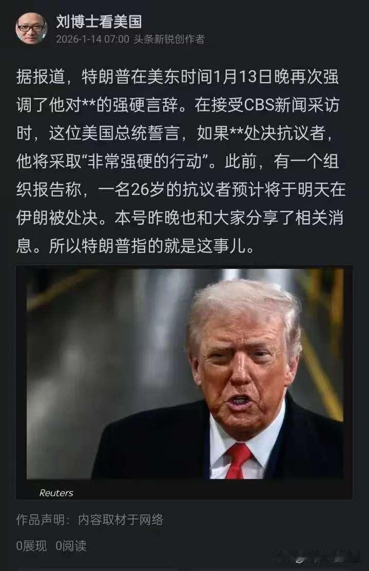 立帖为证!目前哈梅内伊前面的路越走越窄了,要么尽快开溜,要么垮台栽在伊朗人民手上接受审判,要么和萨达姆,卡扎菲,对号入座。美国已经剑拔弩张,剑在弦上了,所有在伊朗美国外交人员己通知撤离,包括英国,法国,澳大利亚,等国人员也正在撤离伊朗,预计美国最迟三天之内对伊朗动手进行打击了!