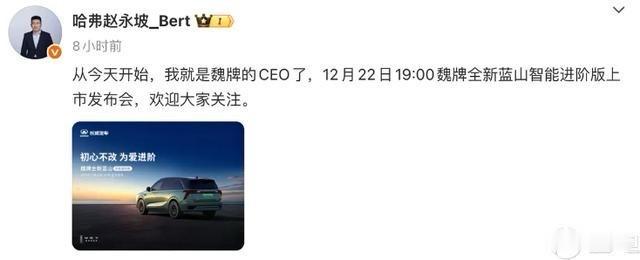 赵总接任魏牌品牌总,到底是什么原因导致魏牌九年换8个CEO,有没有地源问题导致保定吸收不到好的营销渠道人力导致高管没有得力的帮手等等,不妨讲讲魏牌,从魏牌的vv 系列发布以后,当时就掀起了一波小高潮,vv系列的车型在当时已经可以实现月销过万了,后面不知道什么原因vv系列停滞,外观大改,油耗还是感人,就有了咖啡系列,不过咖啡系列并没有vv系列这么好,没过多久拿铁和摩卡在国内月销惨淡,后面有了咖啡智能以后长城汽车在车机跑分拿到了第我一名,这时候大家对长城的高端车有了改变,蓝山也在这个时候诞生,当然了第一代蓝山没有大屏并不是很讨好用户随着更换大屏幕,销量也逐渐月销大几千表现还是很不错的,但是内部的压力对于品牌总而言可能目标太大了吧,期待一下新的品牌总的业绩到底如何