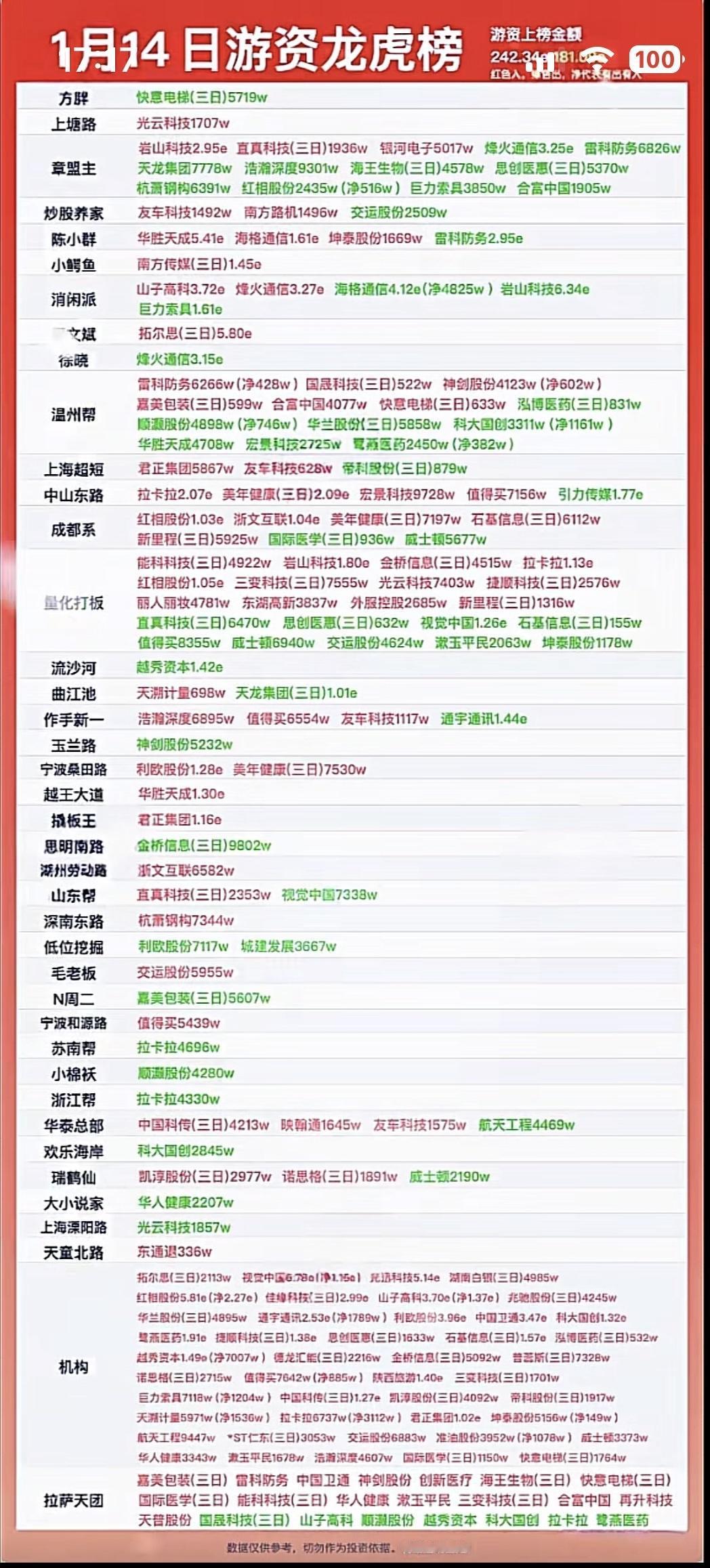 1月14日游资龙虎榜,揭秘大牛股!🐉💰📈 游资龙虎榜活跃,多股获大额买入,市场热度攀升,投资需谨慎。 游资活跃,多股上榜,资金动向引关注,投资需谨慎。