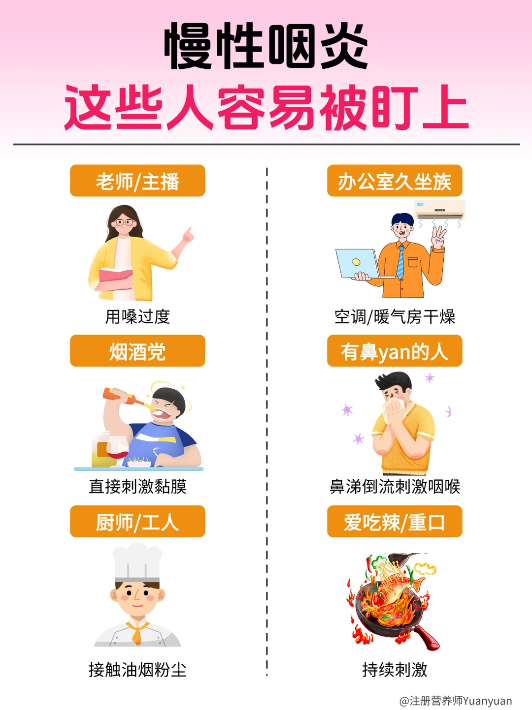 像老师、主播、销售、培训这些长期用嗓的,还有爱抽烟、经常应酬,或者天天待在空调房、暖气房的人,都是慢性咽炎的高发人群!