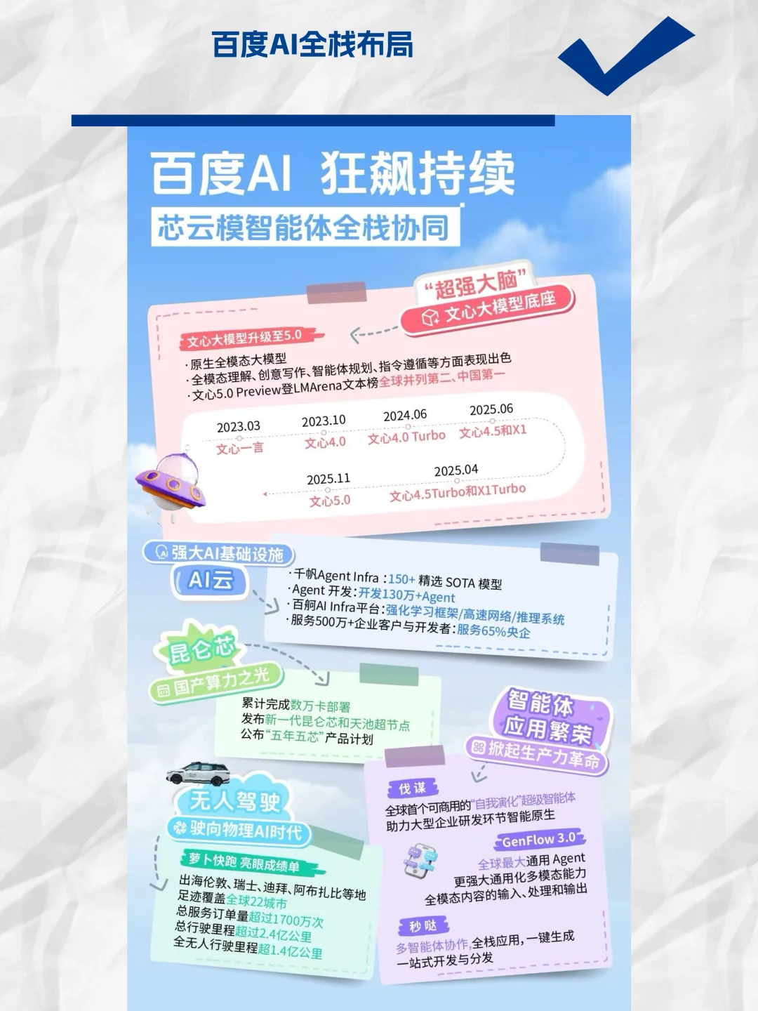 几乎在同一时间段,它的自动驾驶拿下了迪拜首个全无人路测许可、文心大模型在权威榜单上冲到了国内视觉和文本双第一、AI芯片昆仑芯也启动了分拆上市。看似分散的新闻,内核是一条线:它早年铺开的全栈布局(芯片-云-模型-应用),现在到了“结果子”的时候。