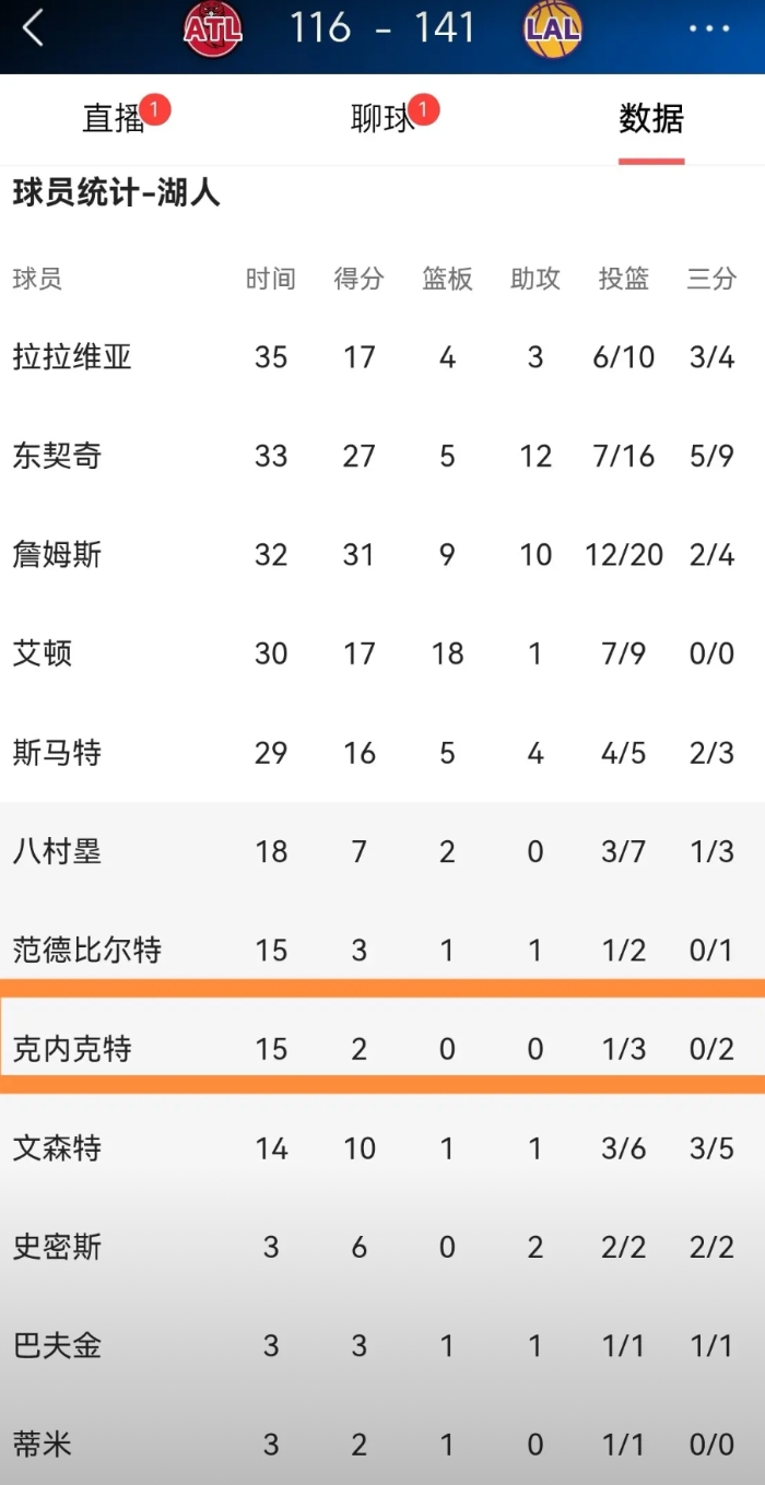 湖人新星克内克特距离被交易走已经越来越近了!在今天湖人主场以141:116大胜老鹰的比赛中,克内克特虽然进入到了球队的常规轮换中却表现低迷,他在替补出战的15分钟里,投篮3中1,其中三分球2中0得到2分,还有2次犯规,他的场上正负值为+4。