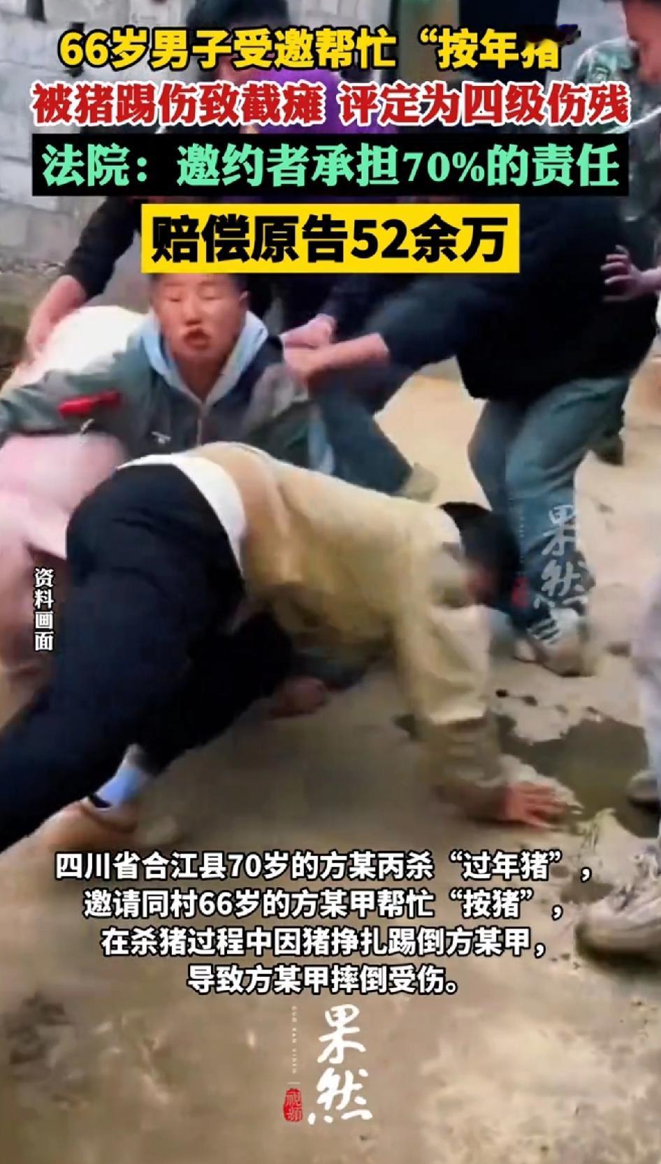 66岁男子受邀帮忙,“按年猪”被猪踢伤至瘫痪,评定为四级伤残。这个年龄还去按年猪,这老爷子也是热心肠,可谁能想到会遭这无妄之灾呢。 “按年猪”本来就是个体力活,还得和猪斗智斗勇,猪那一脚踢得太狠,直接让老爷子瘫痪,评定为四级伤残,这以后的日子可咋过啊。邀请的人也真大胆,老头都66岁了,还去请人家。 老头看到同村人来请自己,也是不好意思拒绝,便跟着去帮忙了,没想到出了这样的意外。 这也提醒咱,热心帮忙是好事,但也得考虑自身身体状况和事情的危险性。就像这老爷子,要是知道会这样,估计也不会去了。